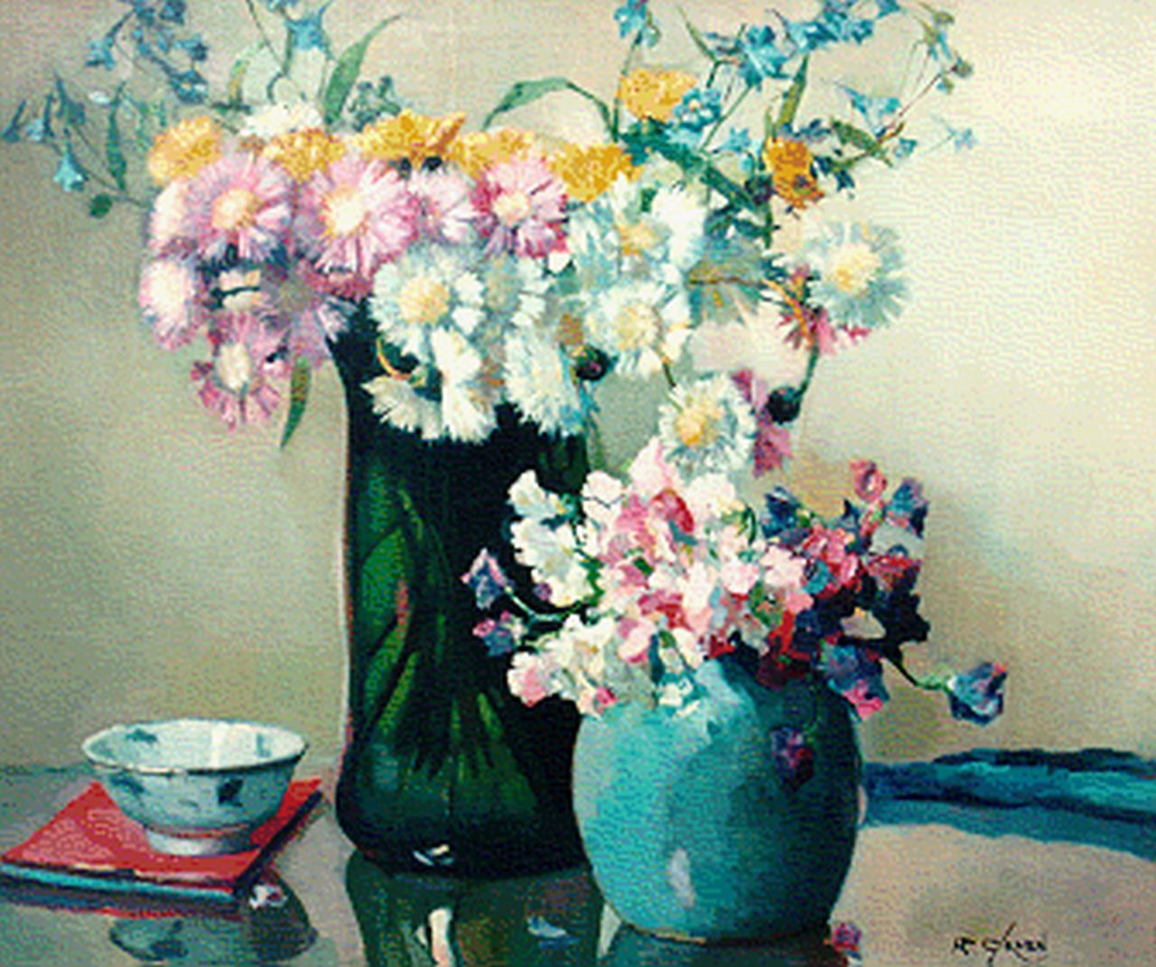 Piet Groen kunstwerk • schilderij • voorheen te koop Twee vazen met bloemen