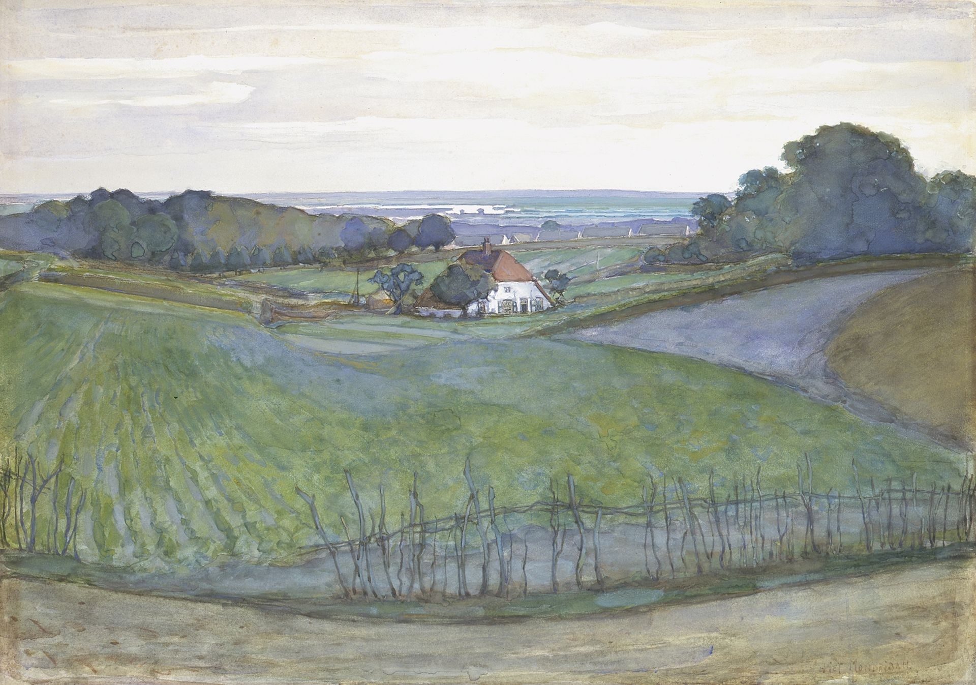 Schilderde, tekende en etste naturalistisch (1888-1908) landschappen, figuren en stillevens, in de overgangsperiode (1909-1915) naar het abstracte neigend, daarna meer en meer abstracte composities. Behoort tot de beroemdste kunstenaars van deze eeuw. Bijna alle belangrijke musea bezitten werk van zijn hand. Datering: 1901 Literatuur: Prof. Robert P. Welsh,‘Piet Mondriaan', Tentoonstelling van vroegere werken, Den Haag 1989, no. 15 (ill.); Prof. Robert Welsh en Joop Joosten, ‘Catalogue Raissonée'. Tentoonstelling: Amsterdam, Arti et Amicitiae, 1901-1902, Gemeente Museum Arnhem. Dit schitterende landschap bij Arnhem schilderde Mondriaan hoogstwaarschijnlijk in 1901. Zijn vader was kort daarvoor vanuit Winterswijk verhuisd naar deze stad, en tijdens de bezoeken die Mondriaan hem bracht vanuit Amsterdam maakte hij een serie schilderijen en aquarellen van de omgeving. De Canadese Mondriaan-expert Robert Welsh voorzag deze aquarel als eerste van een datering en identificeerde het landschap als de omgeving van Arnhem, door verband te leggen met een aquarel van Mondriaan die in de winter van 1901 en het voorjaar van 1902 bij Arti et Amicitiae in Amsterdam was tentoongesteld. De uitwerking van de aquarel doet ook vermoeden dat hij werd gemaakt voor een tentoonstelling of voor de verkoop. In zijn pre-moderne jaren, grofweg van 1895 tot 1908, had Mondriaan een uitgesproken voorkeur voor het schilderen van landschappen, die in hun naturalistische details en atmosfeer verwantschap vertonen met het werk van de Haagse School. Dit is niet zo verwonderlijk. Deze impressionistische stroming beheerste het schilderkunstig klimaat in ons land in de tweede helft van de vorige eeuw vrijwel volledig. Bovendien was er de invloed van Mondriaans oom Frits, zelf een leerling van Willem Maris, die hem vanaf 1898 regelmatig meenam op schildertochten in de buurt van Winterswijk, en hem vertrouwd maakte met de schilderkunst van de Haagse School. De aquarel is bijzonder fijn uitgewerkt. Onder een bedekte hemel ligt iets boven het midden van het beeldvlak een witte boerderij met rood dak, omringd door glooiende akkers in sprekende kleuren groen. In de verte ligt als een witte streep de Rijn. De boompartijen op de overgang tussen midden- en achtergrond presenteren zich als massieve kleurvlakken met sterke contouren. Mondriaan combineerde dit naturalistische landschap met experimenten in beeldopbouw en compositie. Door de boerderij op het snijpunt van twee diagonalen te plaatsen, en vooraan in beeld met scherpe contouren een takkenafscheiding te schilderen, schept hij een spanning tussen de motieven voor en achter in het beeld. Hij maakte beeldelementen als het ware los van het ‘plaatje' en liet ze zien als zelfstandige vormen, die op een bepaalde manier ten opzichte van elkaar geplaatst waren. Het zo vereenvoudigen van de zichtbare wereld tot vormen en vlakken is een vroeg symptoom van zijn latere zoeken naar pure abstractie. Dit is bijvoorbeeld ook te zien in de serie aquarellen en olieverfstudies die hij in deze vroege periode maakte langs het Gein, waarvan er een aantal in het bezit is van het Haags Gemeentemuseum. Na 1908 brak Mondriaan in zijn schilderij ‘Molen bij zonlicht' met het naturalisme van zijn vroege werk en betrad hij, met het steeds verder vereenvoudigen van vorm en kleur, de weg naar zijn neo-plasticisme, waar hij beroemd om werd.