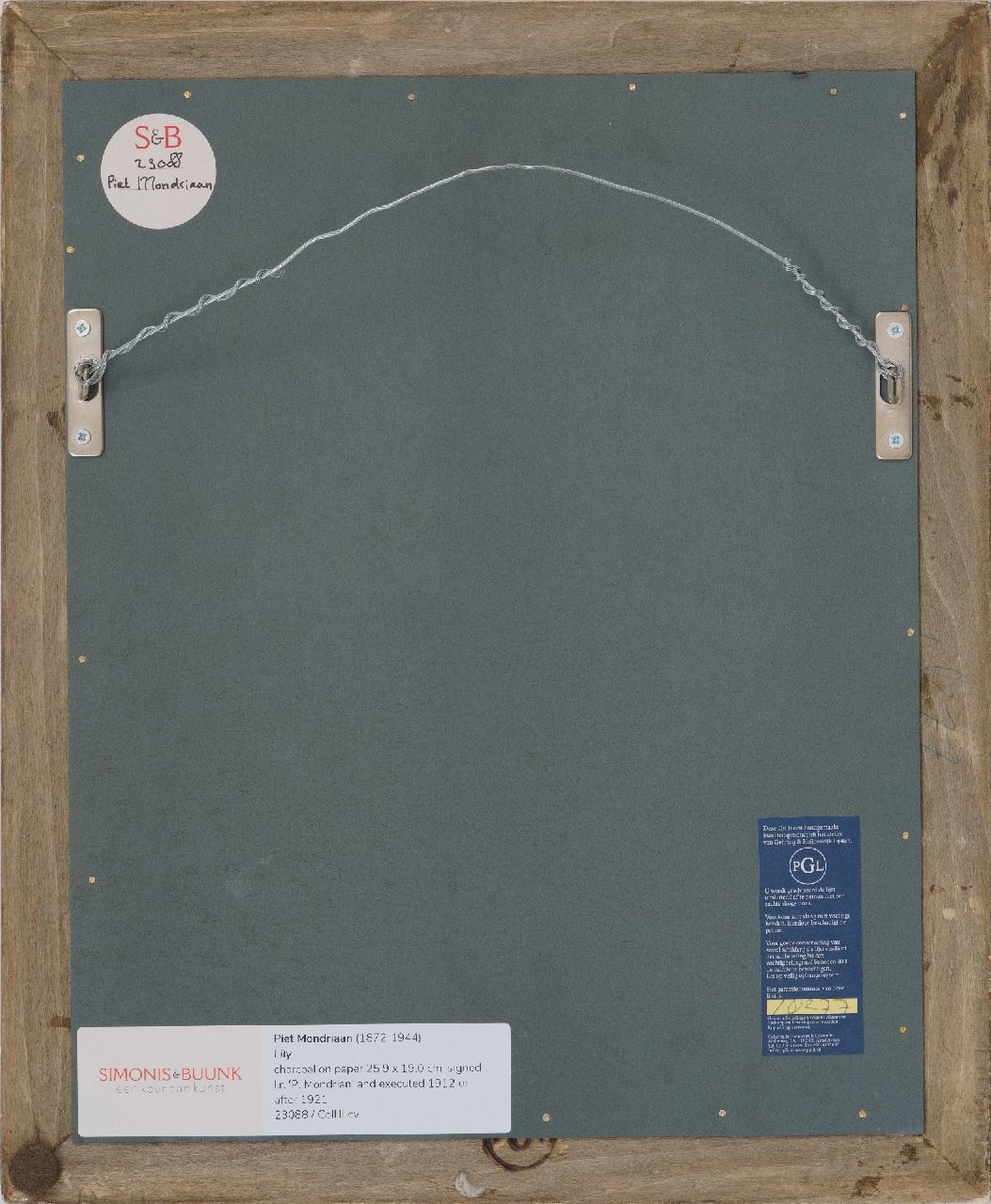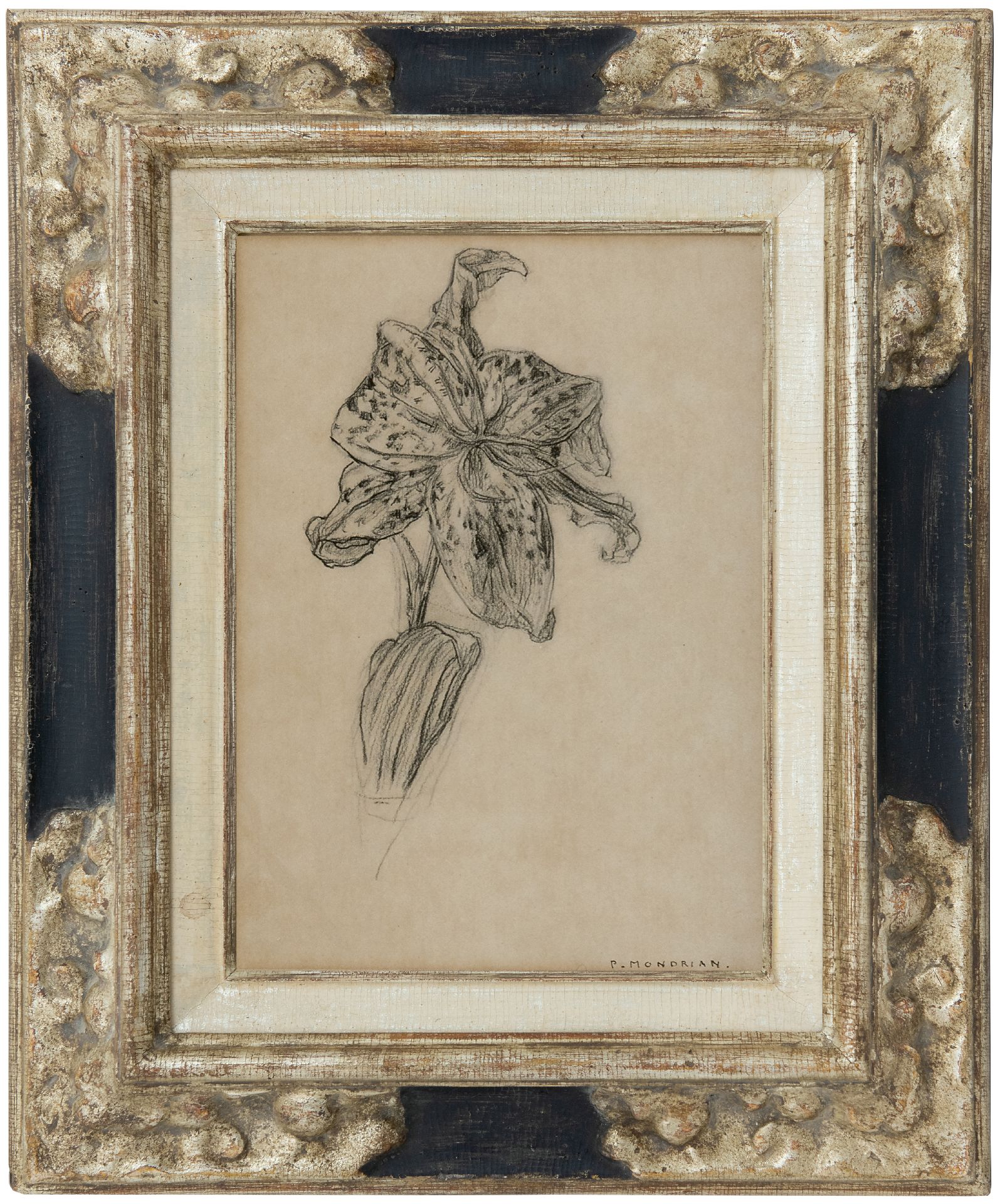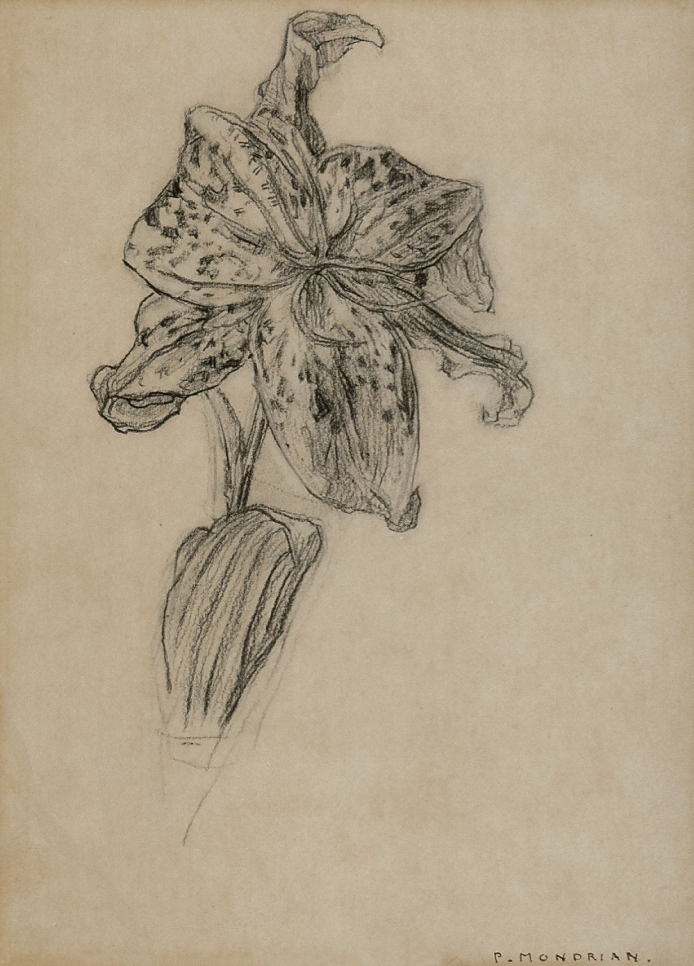Kort geleden verwierven wij uit particulier bezit een interessant werkje van Piet Mondriaan: een met houtskool getekende lelie. Vanaf juni 1911 woonde Mondriaan in Parijs en signeerde vrijwel alleen nog met P. Mondrian, zoals op dit werk. Bekend is dat hij regelmatig bloemen schilderde om in zijn onderhoud te voorzien. Spiritueel als hij was bracht hij deze voelbaar naar een hoger plan. Begin jaren 20, toen Mondriaan vrijwel geen inkomsten had, maakte hij voor de kunstmarkt opnieuw serene bloemmotieven. Een vergelijkbare voorstelling in aquarel, te dateren ca. 1910 en gesigneerd P. Mondriaan, bevindt zich in de Sidney Janis Family Collections, New York en wordt in de catalogue raisonné toch begin jaren 20 gedateerd, zij het onder voorbehoud.