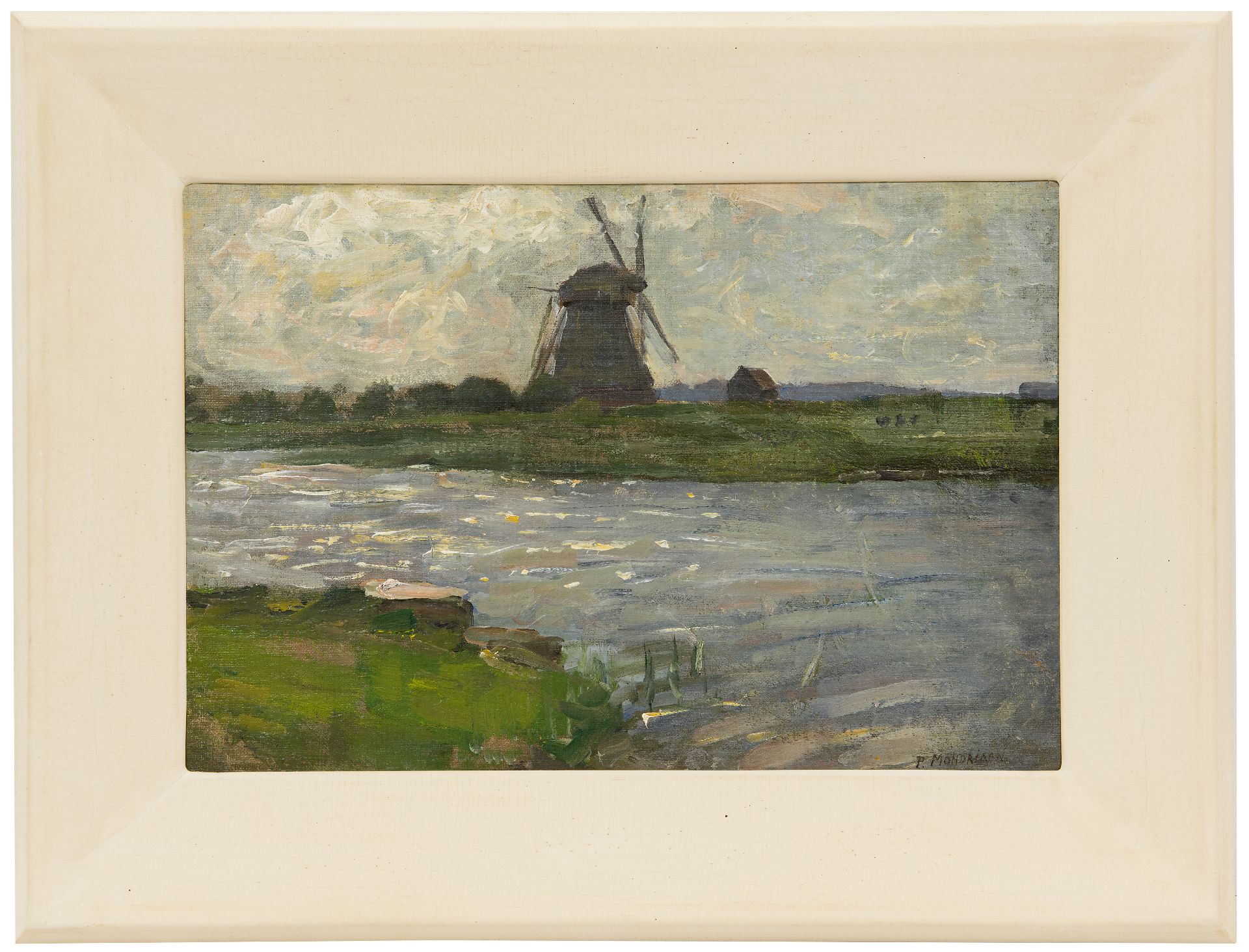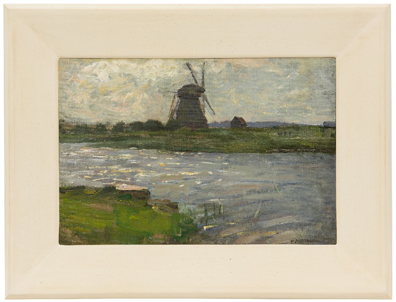 In 2005 verkocht Simonis & Buunk een gezicht op de Oostzijdse Molen bij maanlicht door Piet Mondriaan aan het Rijksmuseum. Dit schilderij, dat gedateerd wordt rond 1903, maakt deel uit van de indrukwekkende serie landschappen die Mondriaan schilderde langs het Gein. Opnieuw hebben we een schilderij van de Oostzijdse Molen uit deze vroegste periode in ons bezit: 'De Oostzijdse Molen aan het Gein, gezien vanaf boerderij Landzicht', eveneens te dateren ca. 1903. Grofweg tussen 1900 en 1911 schilderde Mondriaan een reeks landschappen met molens in de omgeving van de rivier het Gein bij Abcoude. Mondriaan bezocht dit gebied vanuit Amsterdam, waar hij zich in 1892 vanuit Winterswijk vestigde om een opleiding te volgen aan de Rijksacademie. Op de fiets of per trein ging hij naar Abcoude, om van daaruit een stek te zoeken om te schilderen. De Oostzijdse Molen, die zich op loopafstand ten oosten van Abcoude bevindt, was toen een van Mondriaans geliefdste motieven. De achtkantige, met riet gedekte schepradmolen was in 1874 gebouwd als vervanger voor diens afgebrande voorganger. Mondriaan werd gegrepen door het typisch Hollandse onderwerp. Tussen 1902 en 1908 heeft hij hem vele malen, vanuit diverse standpunten, op verschillende uren van de dag en bij verschillend weer en licht weergegeven: bij dag, zonsondergang of nacht, vanaf de overkant of niet, op staand en op liggend formaat, in een naturalistisch-impressionistische tot pre-luministische stijl. ‘Ik ben niet uit op schilderijen, ik ben uit op ontdekkingen’ moet hij hierover eens gezegd hebben. De molens kan men dan ook zien als weerslag van zijn zoeken naar telkens nieuwe oplossingen voor de vormproblemen waarvoor hij zich gesteld zag, vormkwesties voortkomend uit zijn veranderende (kunst)theoretische opvattingen. Mondriaan heeft voor dit schilderij een standpunt gekozen aan de overkant van het Gein vanaf de kleine steiger van boerderij Landzicht, daar waar de rivier een bocht maakt en het water breed is. De horizon is hoog gehouden, waardoor de nadruk komt te liggen op de rivier tussen de schilder en de molen. Rechts zien we nog het kleine zomerhuisje waar de molenaar en zijn gezin in de zomermaanden woonden, rechts daarvan wat koeien, aangegeven met een stip verf. Eigenlijk gaat alle aandacht naar het bewogen water dat op de winderige dag glinstert in de zon. Met brede, horizontale penseelstreken en vlugge, subtiele toetsen schildert Mondriaan het Gein en het effect van wind en zonlicht op het water. Met op de achtergrond, afstekend tegen de bewogen lucht, het stoer silhouet van ‘zijn’ Oostzijdse Molen.