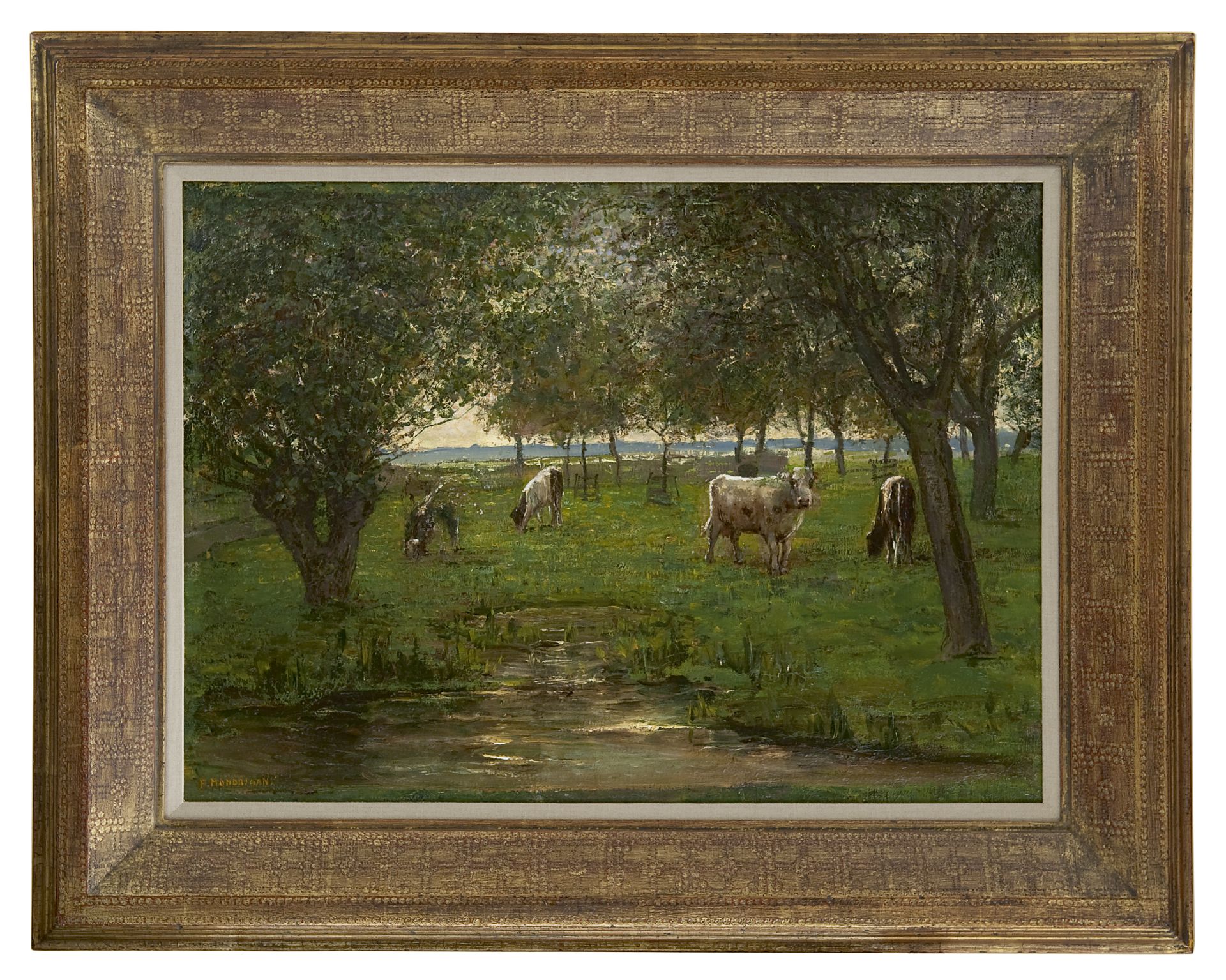 annotatie in potlood op spieraam: 'No.2 'Grazende Kalfjes'' en signatuur: 'Mondriaan - Ringdijk 81';