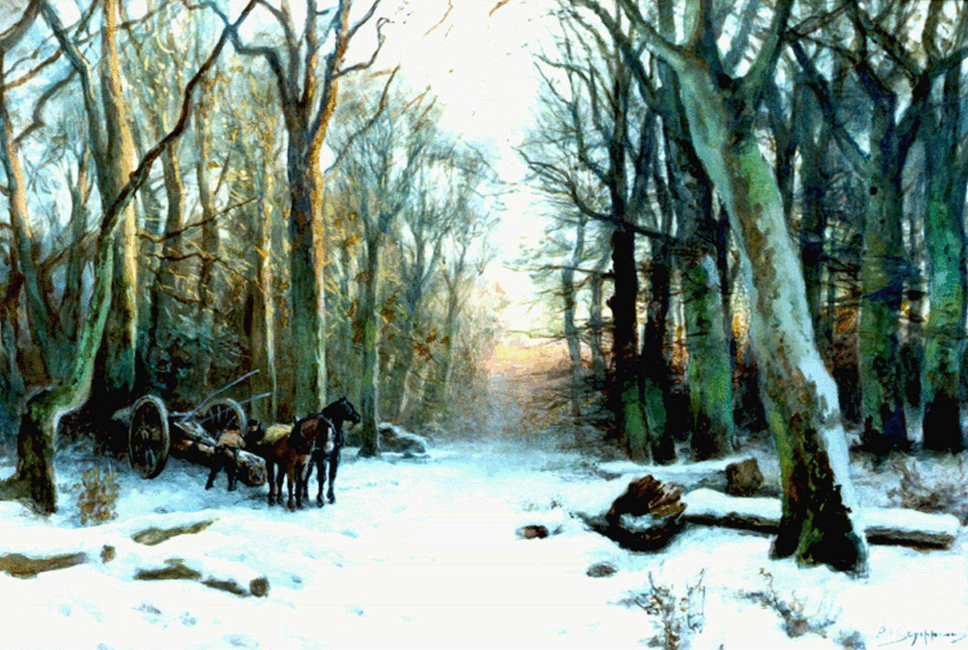 Piet Schipperus kunstwerk • aquarel • tekening • voorheen te koop Paarden in een winters bos