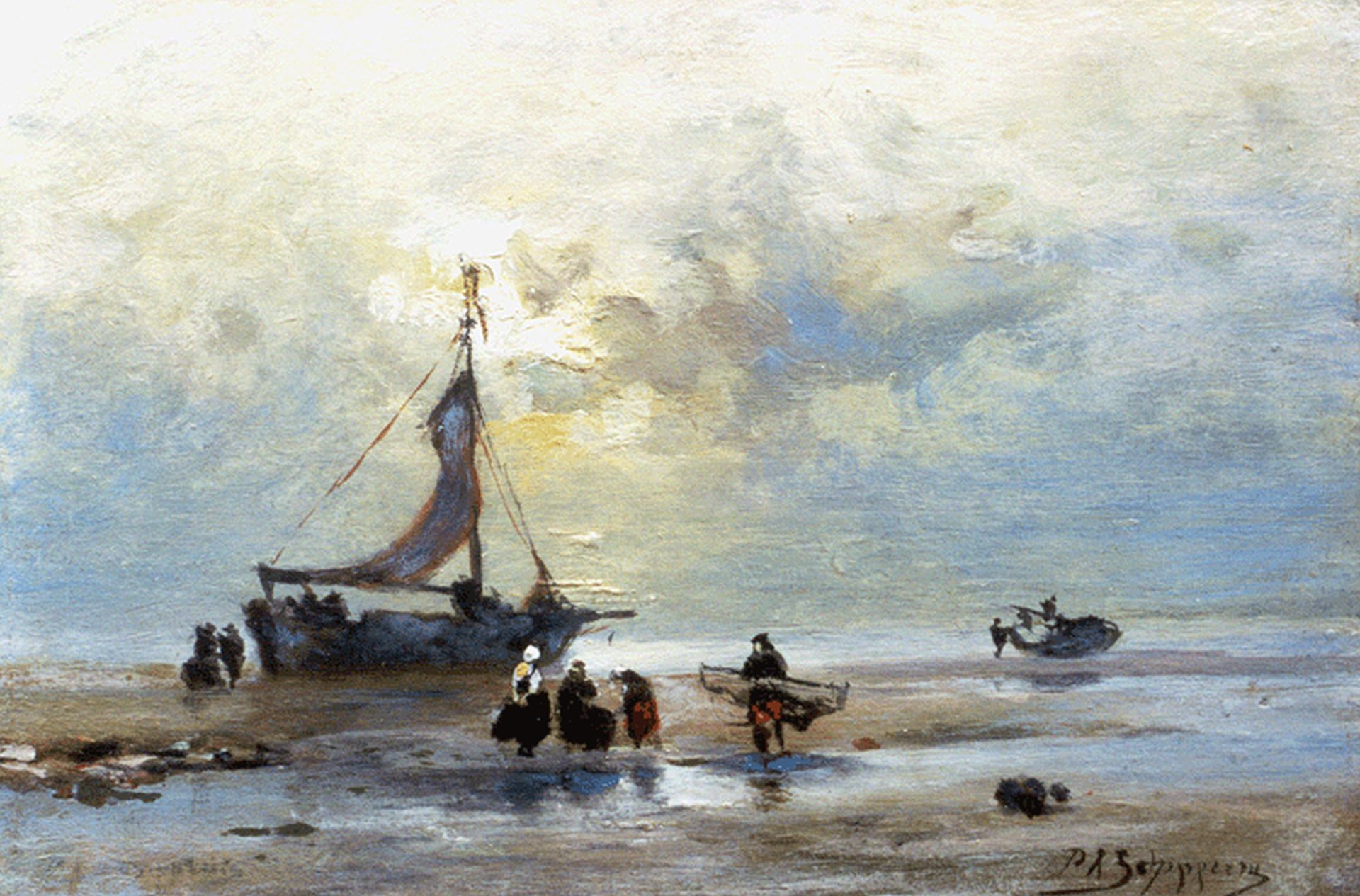 Piet Schipperus kunstwerk • schilderij • voorheen te koop Bomschuit met vissersvolk, Scheveningen