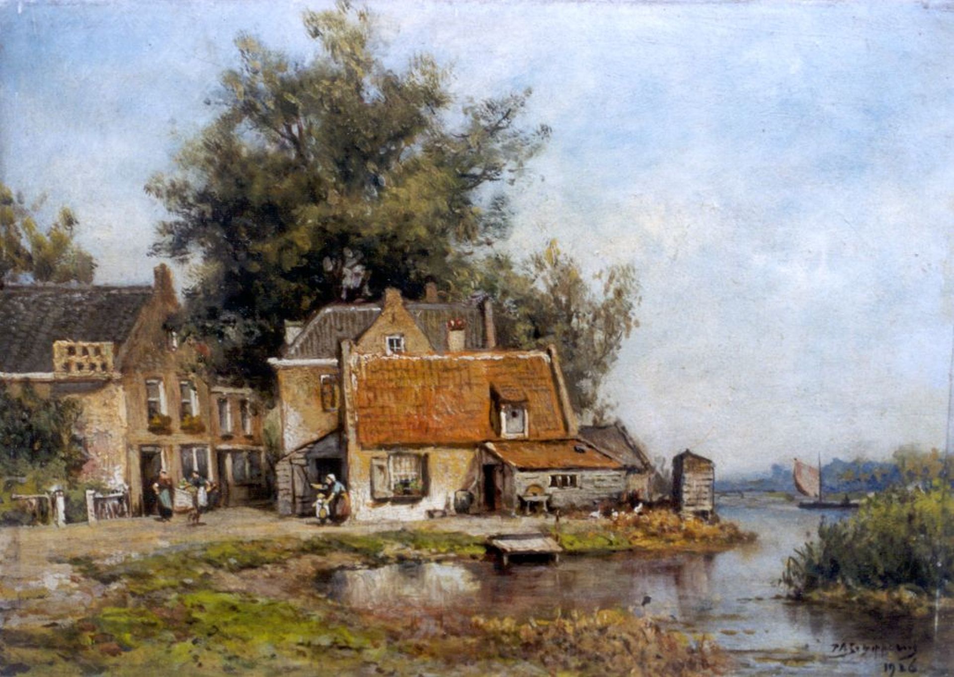 Piet Schipperus kunstwerk • schilderij • voorheen te koop Dorpje bij de waterkant