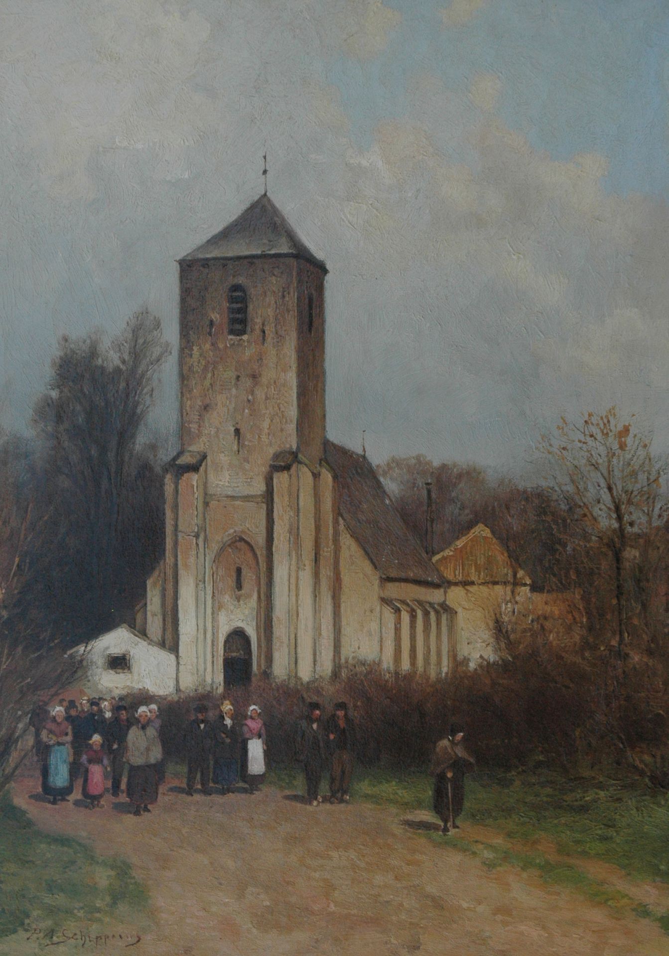 Piet Schipperus kunstwerk • schilderij • voorheen te koop Het uitgaan van de Grote Kerk in Lisse