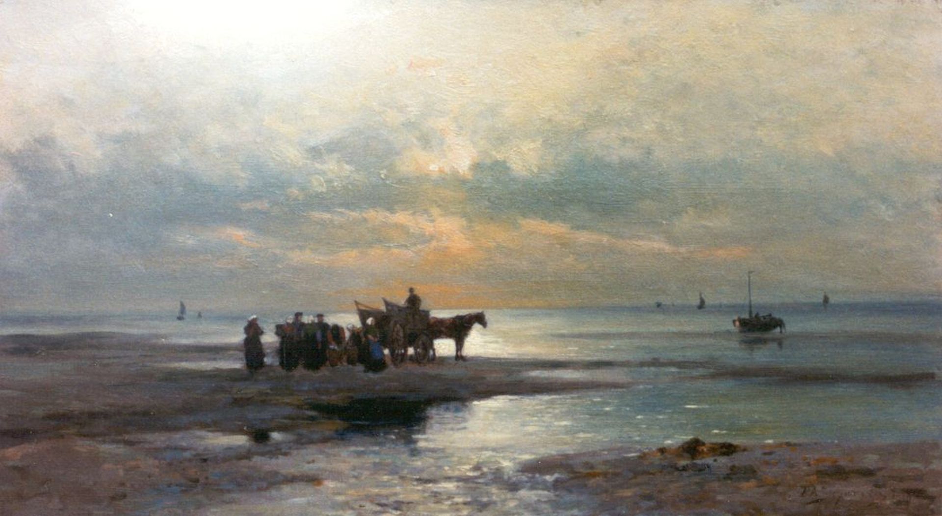 Piet Schipperus kunstwerk • schilderij • voorheen te koop Schelpenkar en vissers bij ondergaande zon