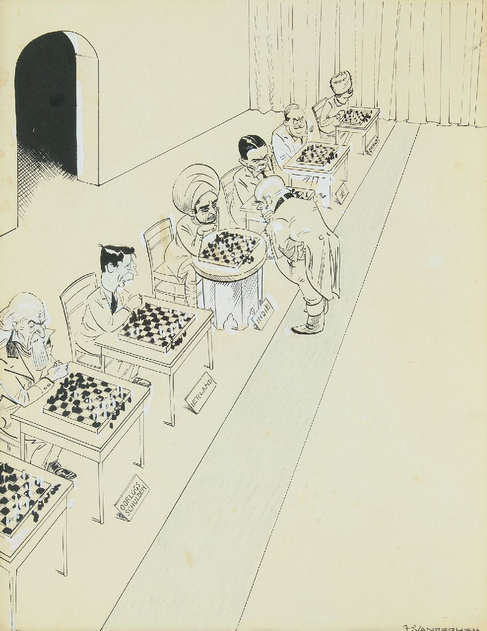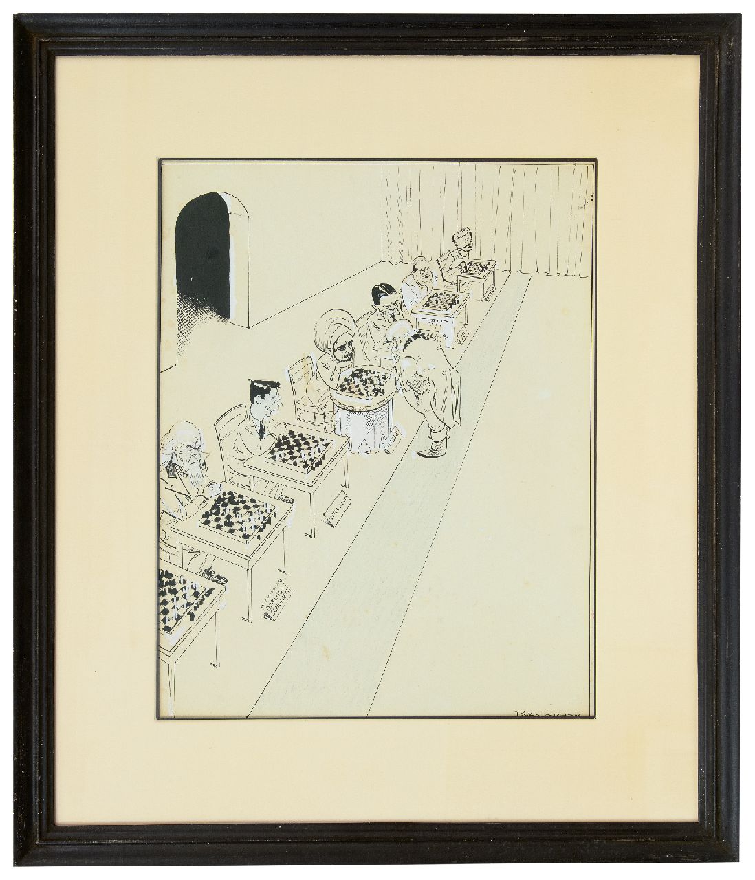 Piet van der Hem kunstwerk • aquarel • tekening • te koop John Bull als simultaan schaakspeler