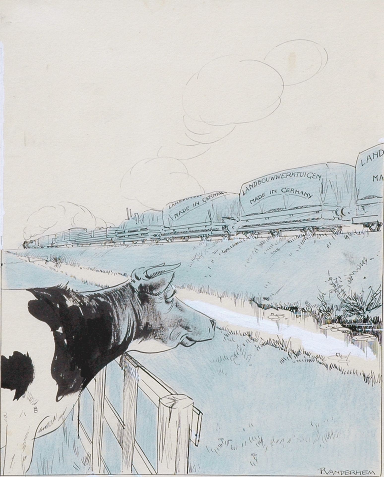Piet van der Hem kunstwerk • aquarel • tekening • voorheen te koop Politieke spotprent 'Welkom vreemdeling, tenminste…'. De boycot van den Zuivelbond Opgeschort, 16 augustus 1930