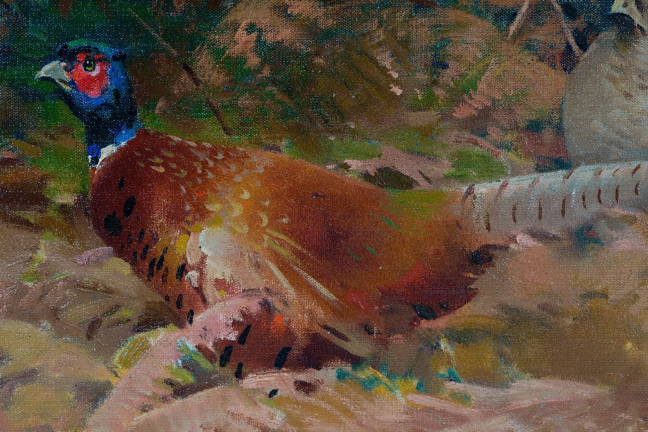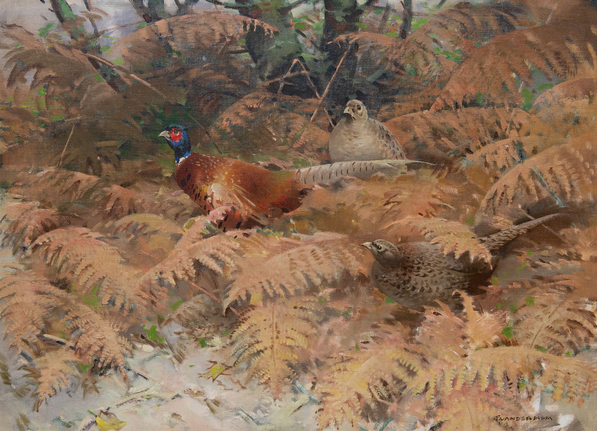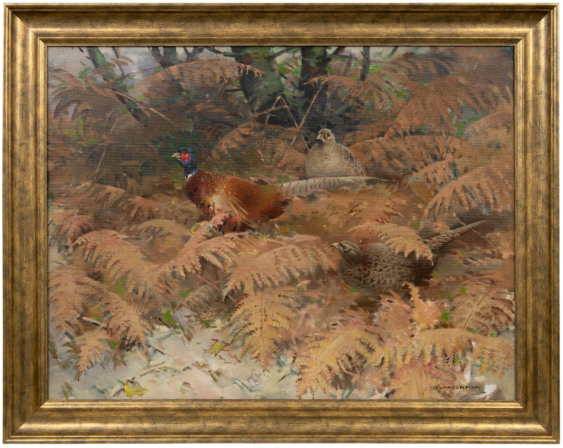 Piet van der Hem kunstwerk • schilderij • te koop Fazantenhaan met twee hennen tussen varens