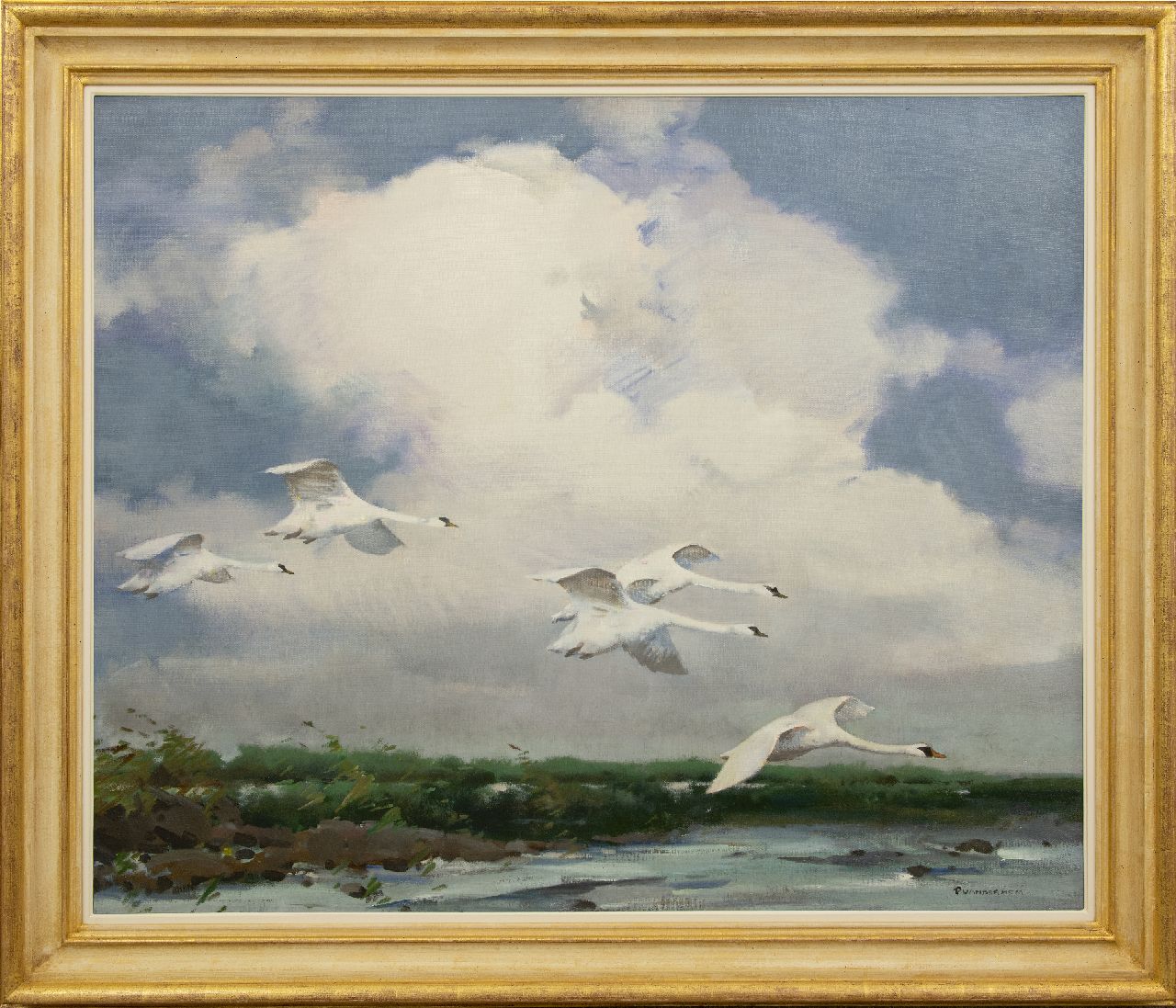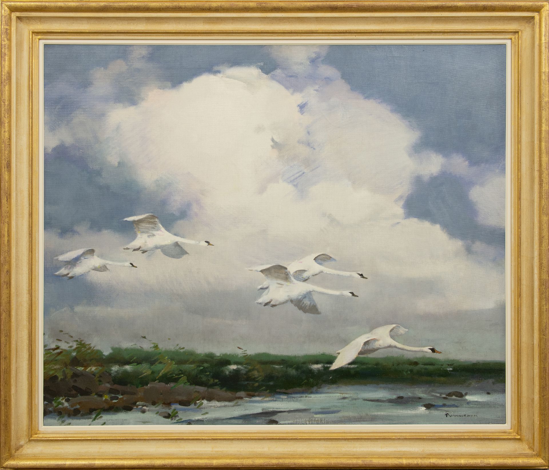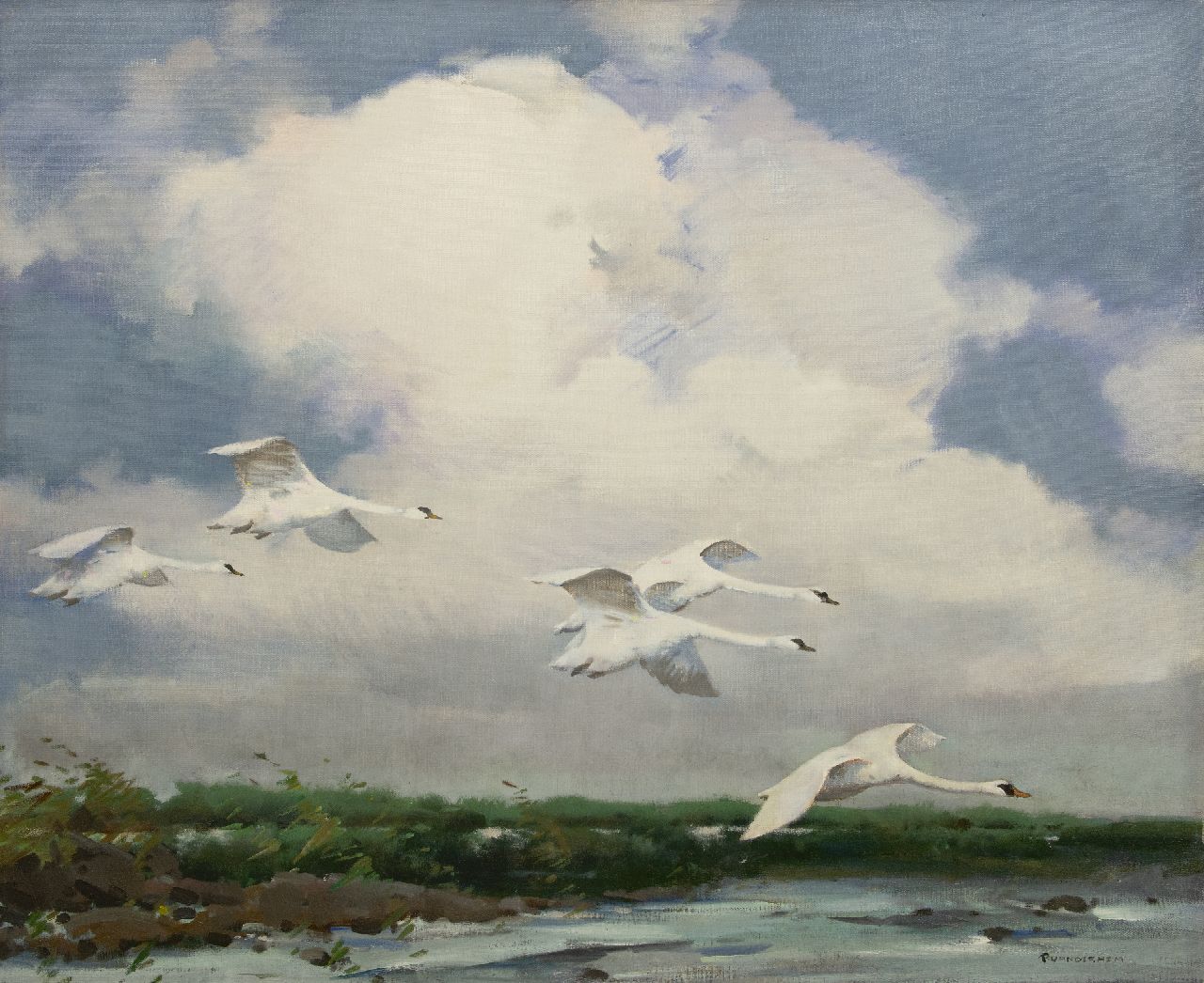 Piet van der Hem kunstwerk • schilderij • voorheen te koop Vliegende knobbelzwanen boven het water