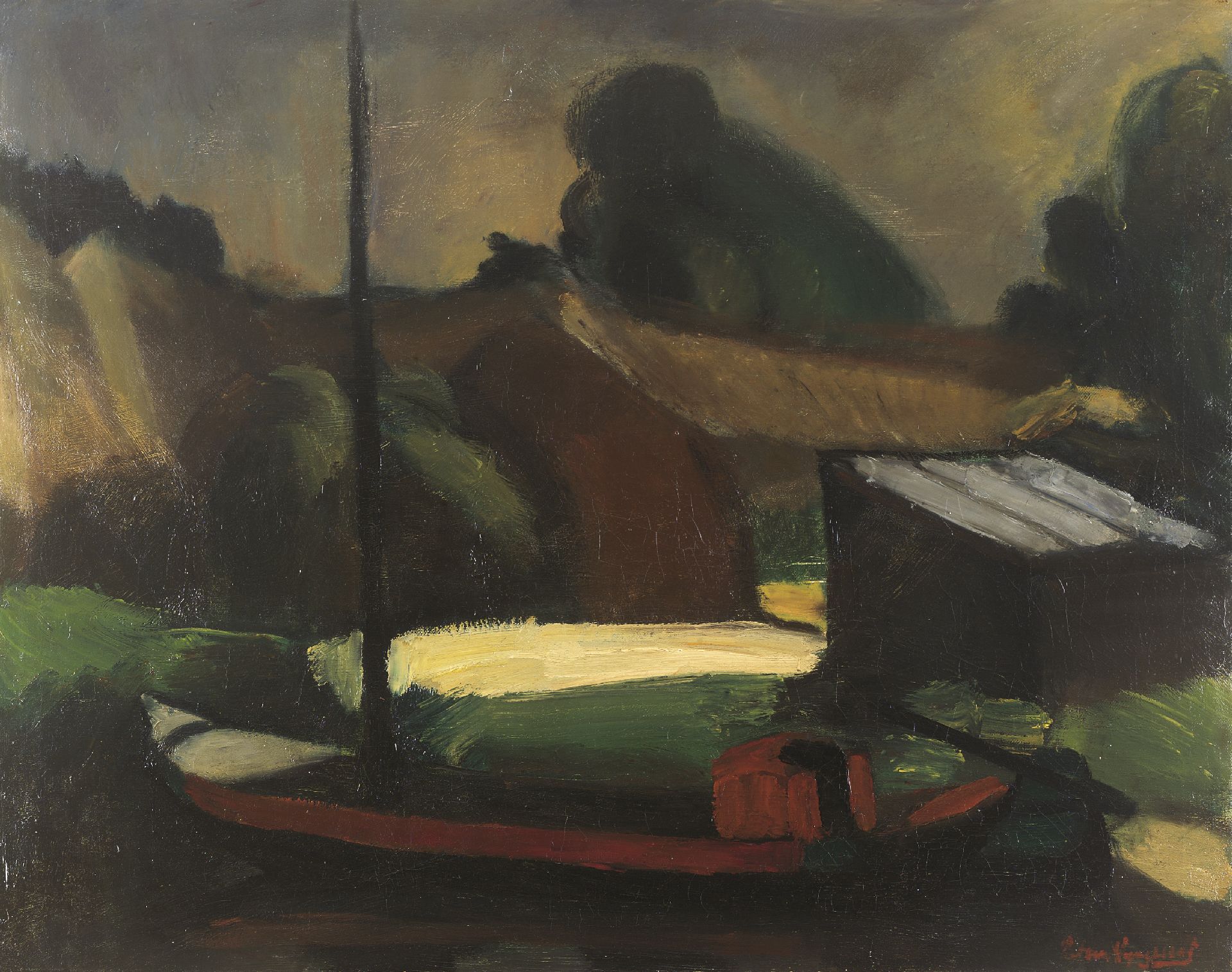 Piet van Wijngaerdt kunstwerk • schilderij • voorheen te koop Schuit bij een schuur