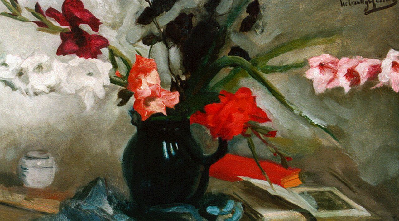 Piet van Wijngaerdt kunstwerk • schilderij • voorheen te koop Stilleven met een vaas gladiolen en een boek