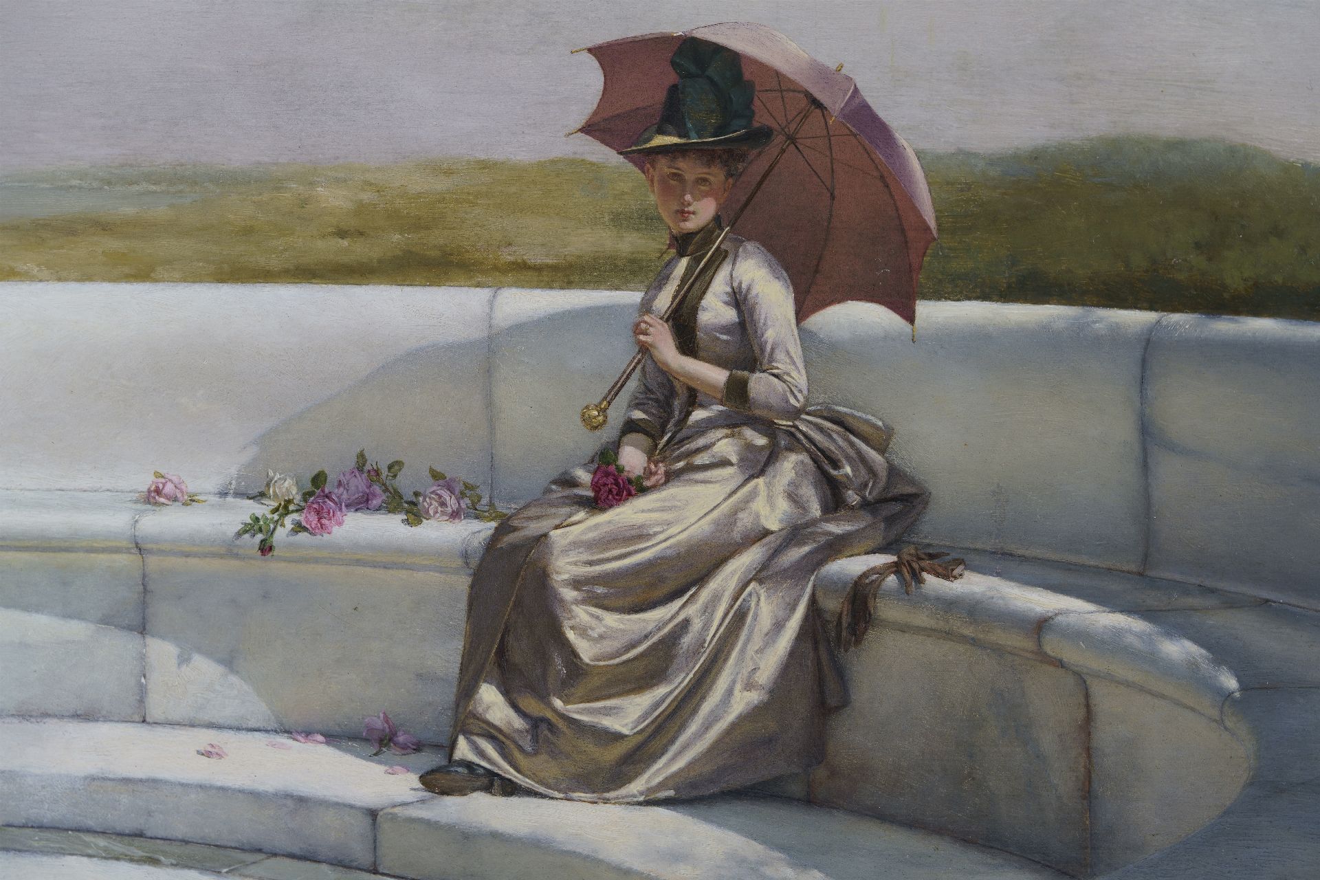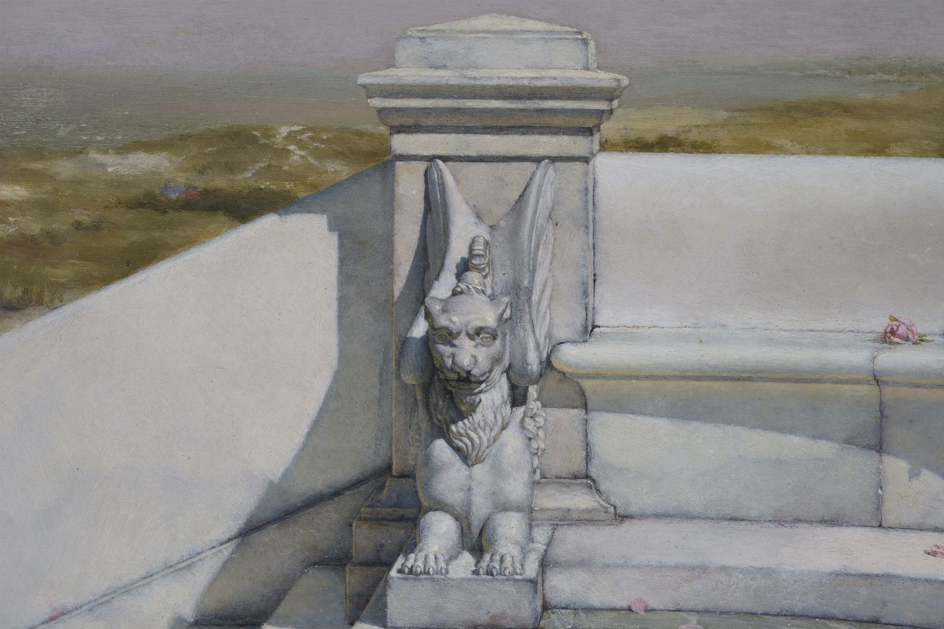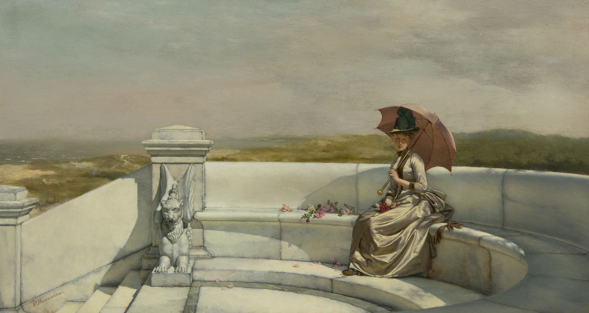 De bank op dit schilderij van Haaxman vertoont gelijkenis met de Haagse Ver Huellbank, die in 1881 werd geplaatst bij de waterpartij in de Scheveningse Bosjes, ter nagedachtenis aan het Haagse gemeenteraadslid H.C.A. Ver Huell (1820-1881). Ver Huell was verantwoordelijk voor de aanleg van het bospark en waterpartij op het terrein van de Scheveningse Bosjes. De bank werd ontworpen en uitgevoerd door de Belgische beeldhouwer Eugène Lacomblé in een internationale, neo-classicistische stijl. In het werk van land- en tijdgenoot Lourens Alma Tadema, die in zijn genrevoorstellingen teruggaat op de klassieke oudheid, komen dergelijke marmeren banken veelvuldig voor.