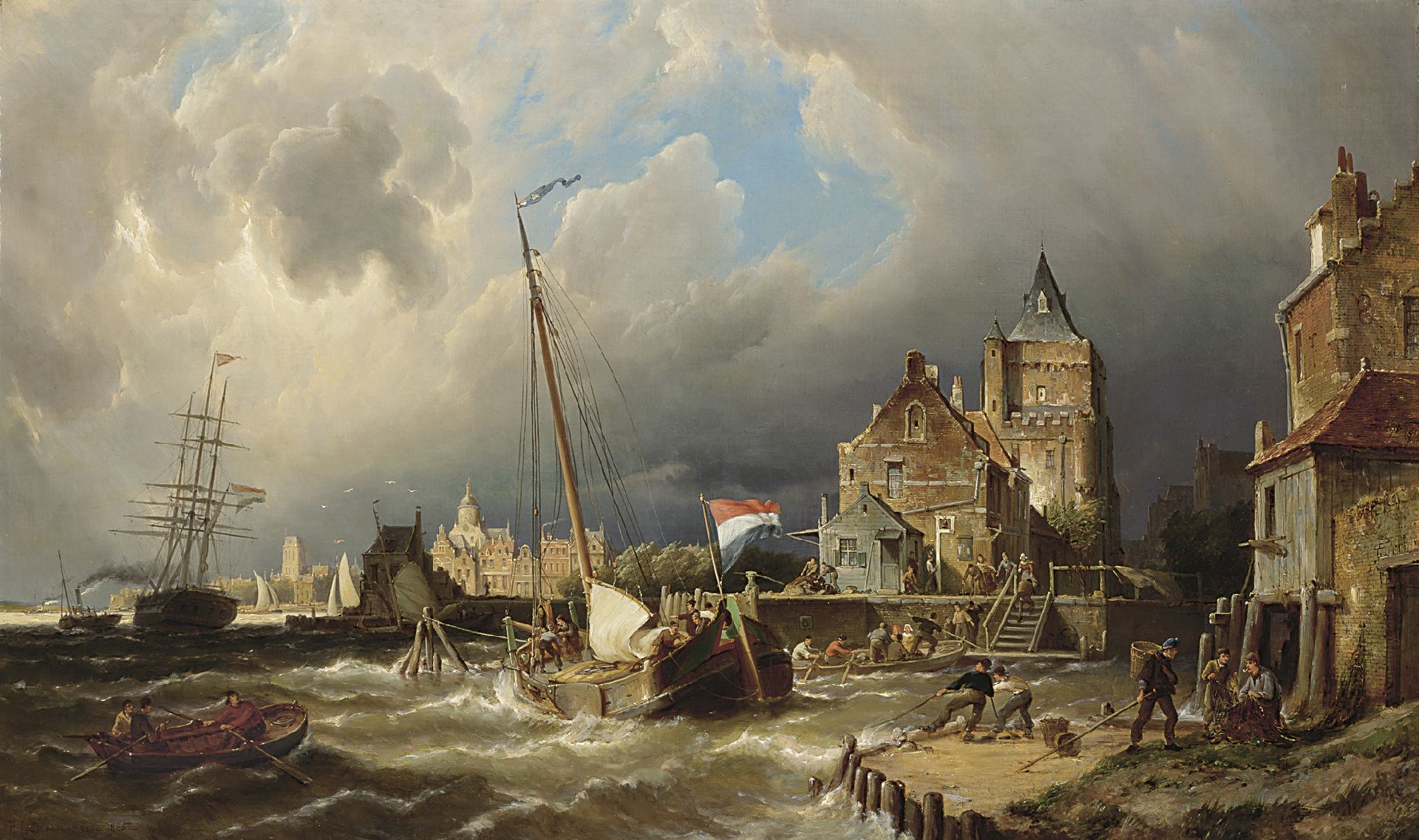 Pieter Cornelis Dommershuijzen kunstwerk • schilderij • voorheen te koop Beurtschip in de havenmonding van Dordrecht bij opkomende storm