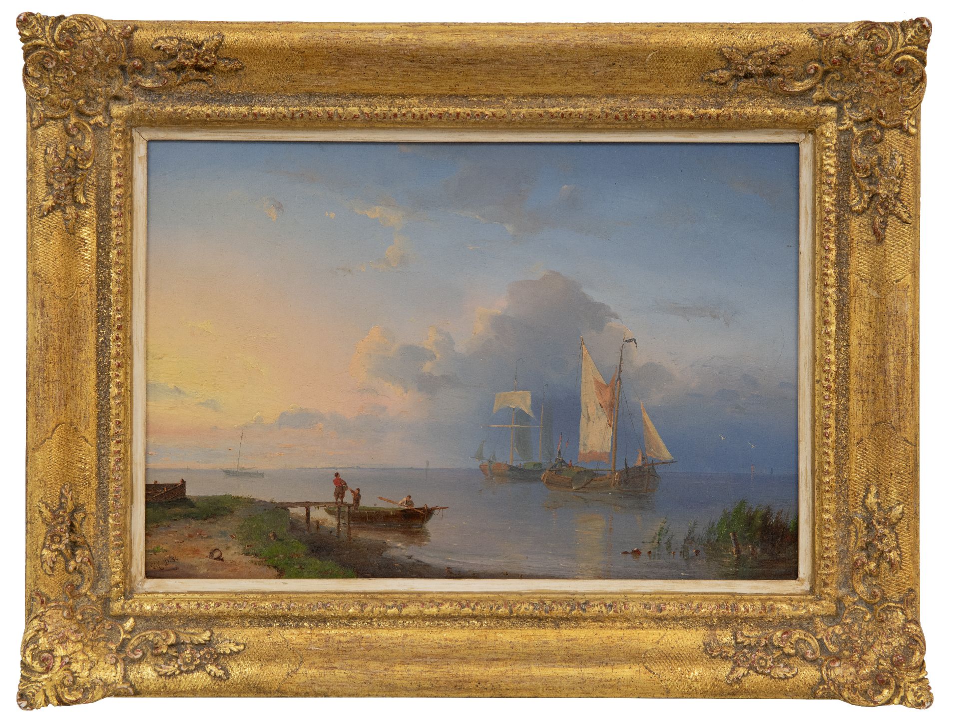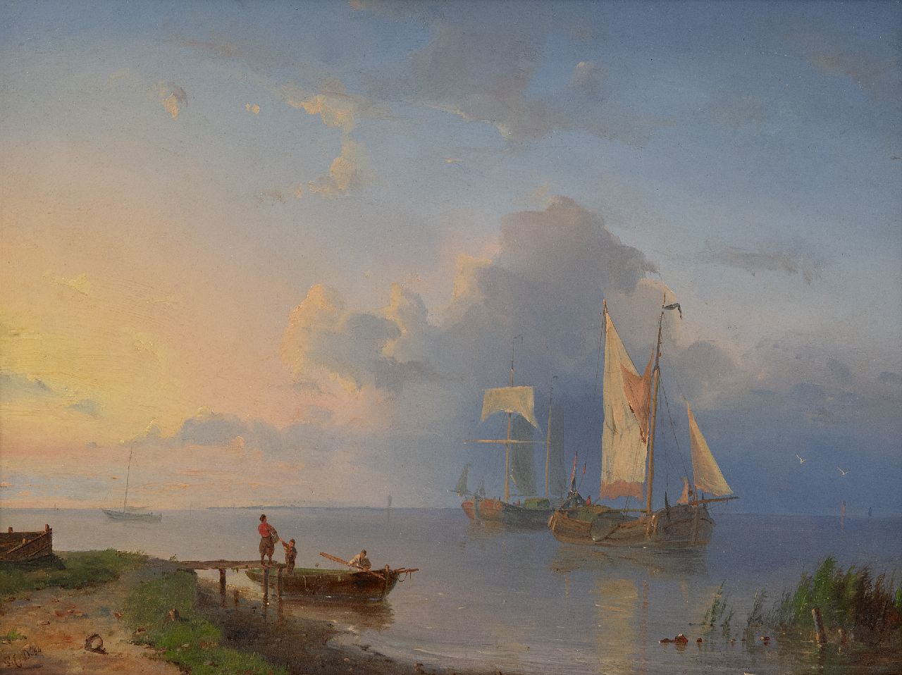 Pieter Cornelis Dommershuijzen kunstwerk • schilderij • te koop Rivierlandschap met zeilschepen bij opkomende zon