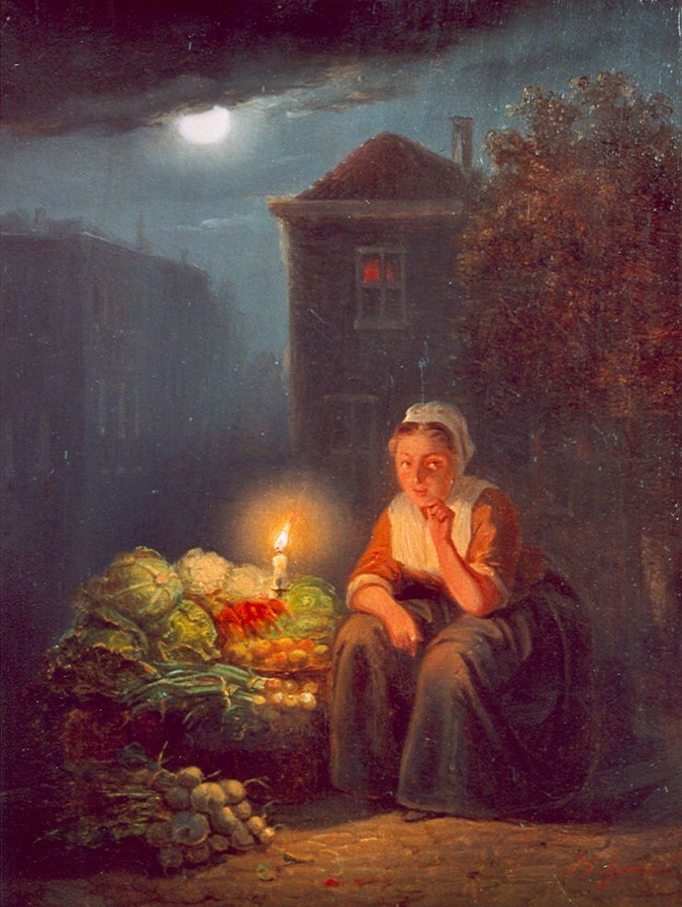 Groenteverkoopster bij kaarslicht