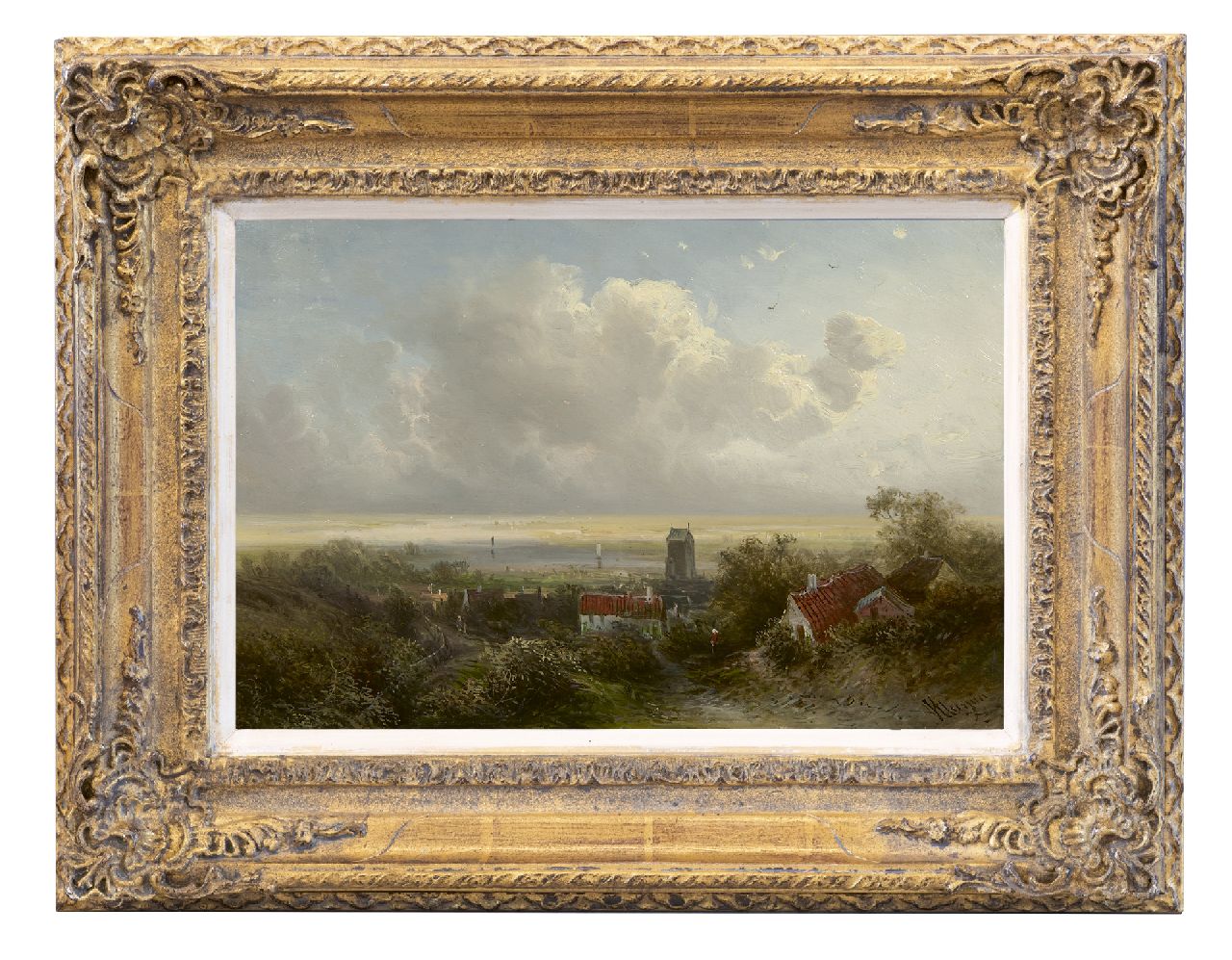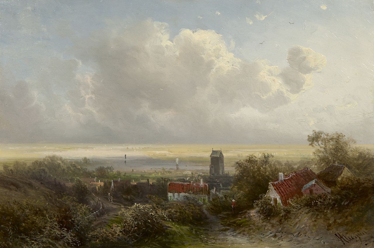Pieter Kluyver kunstwerk • schilderij • te koop Gezicht op een dorp met kerk op een riviervallei