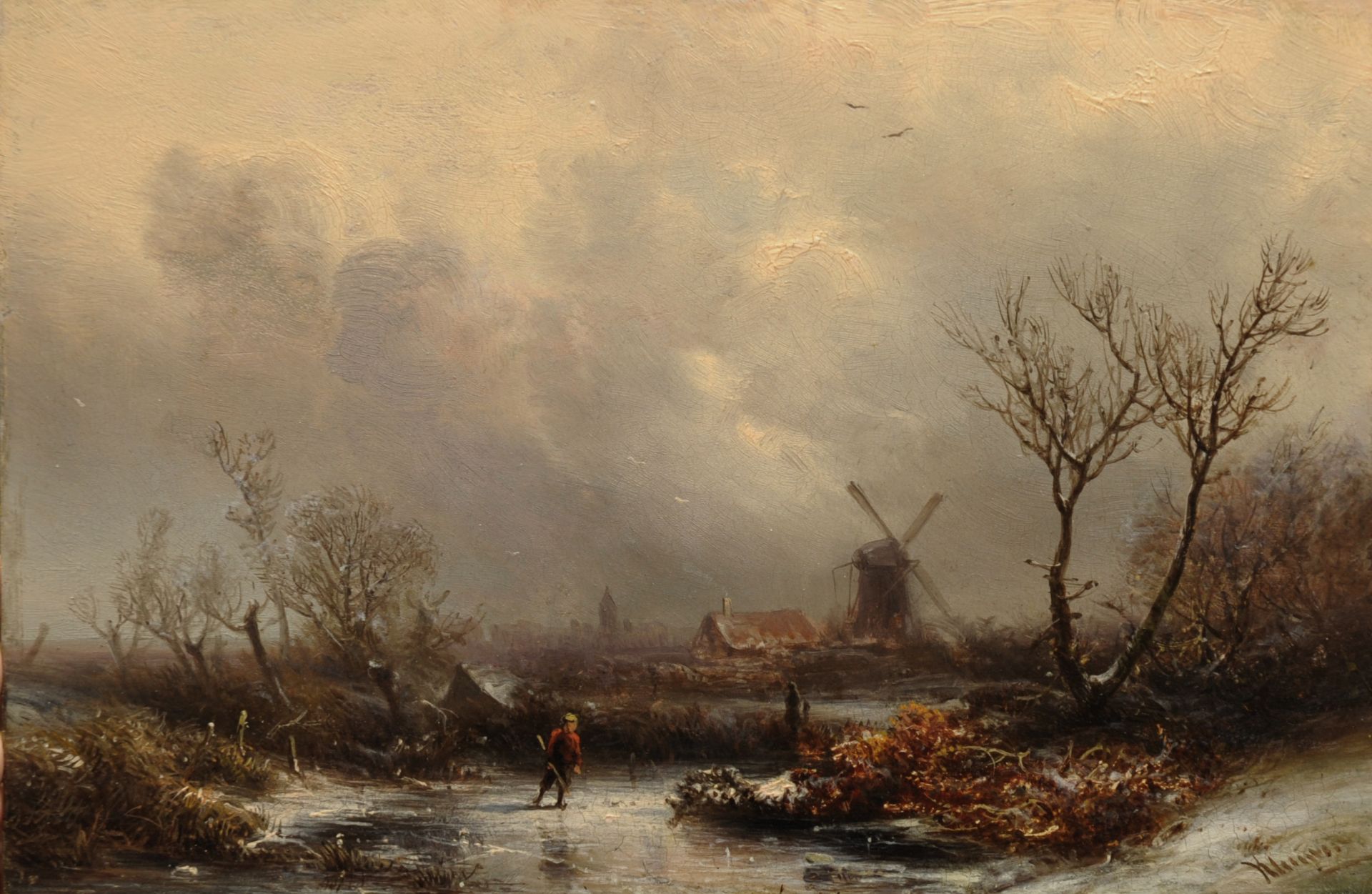 Pieter Kluyver kunstwerk • schilderij • voorheen te koop Schaatser in een winterlandschap