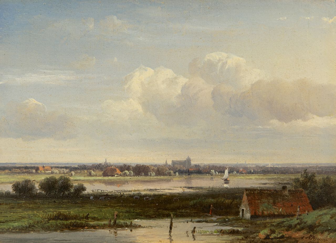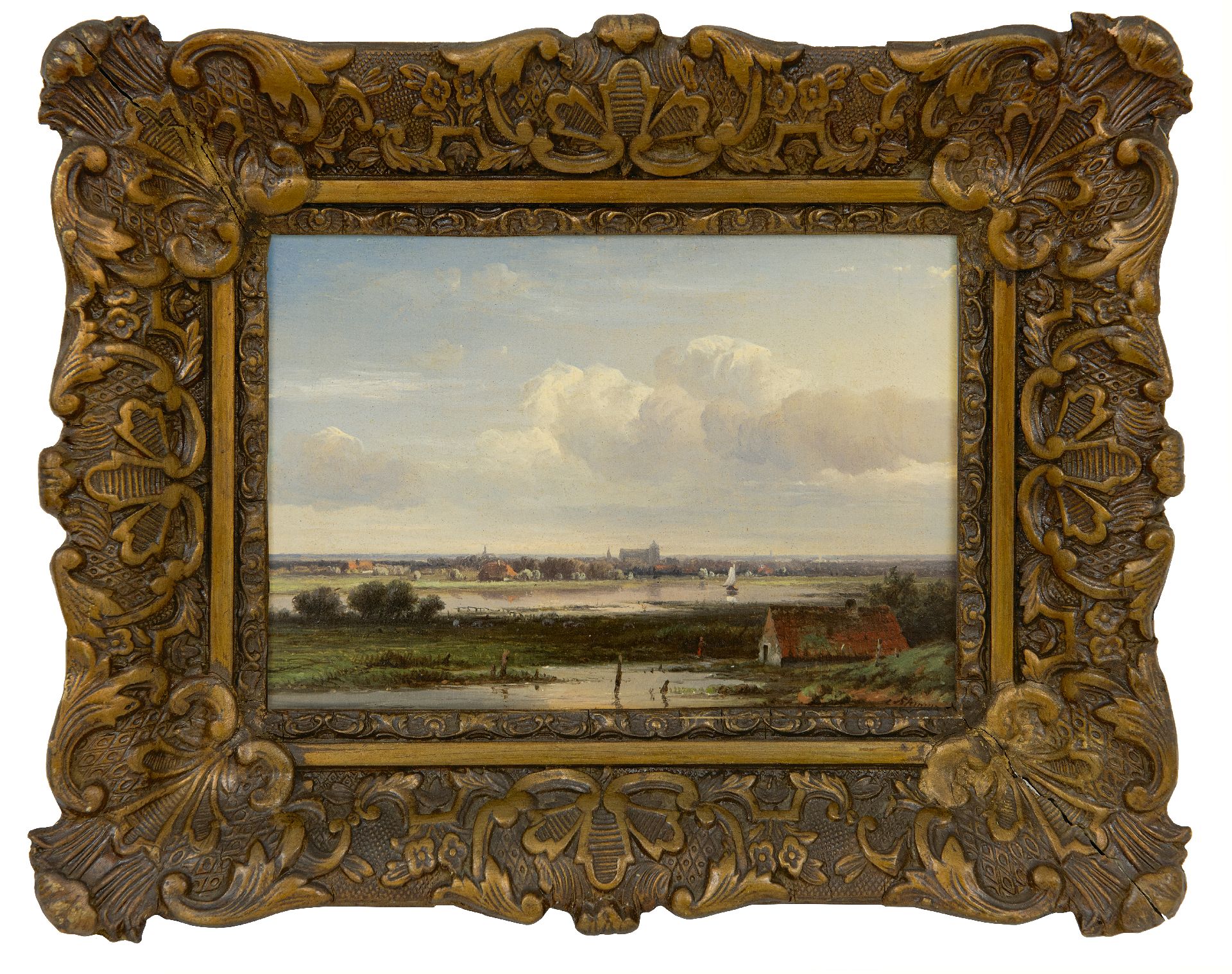 Pieter Kluyver kunstwerk • schilderij • te koop Uitgestrekt rivierlandschap met dorpje in de verte