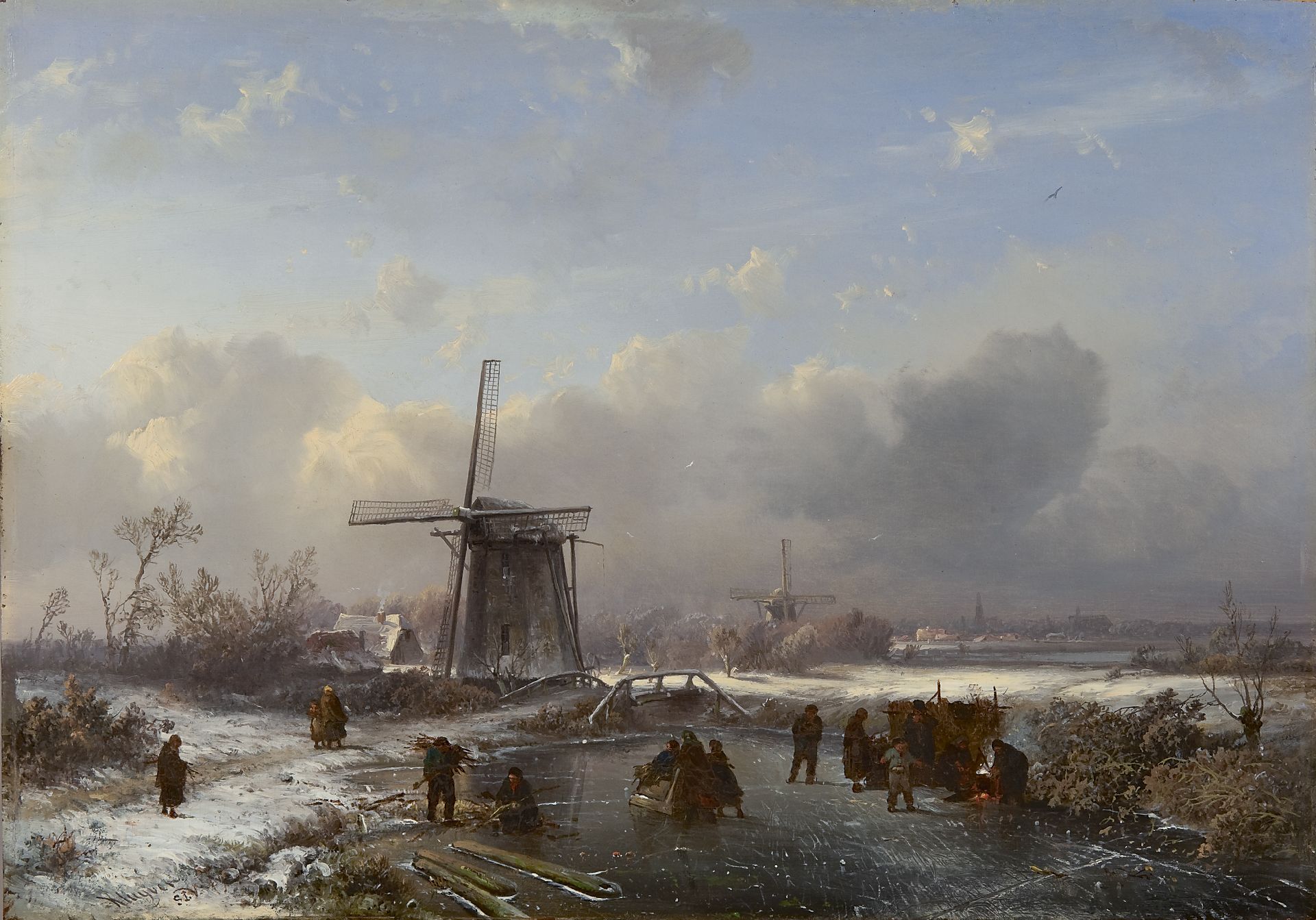 Pieter Kluyver kunstwerk • schilderij • voorheen te koop Winterlandschap met schaatsers en koek-en-zopie