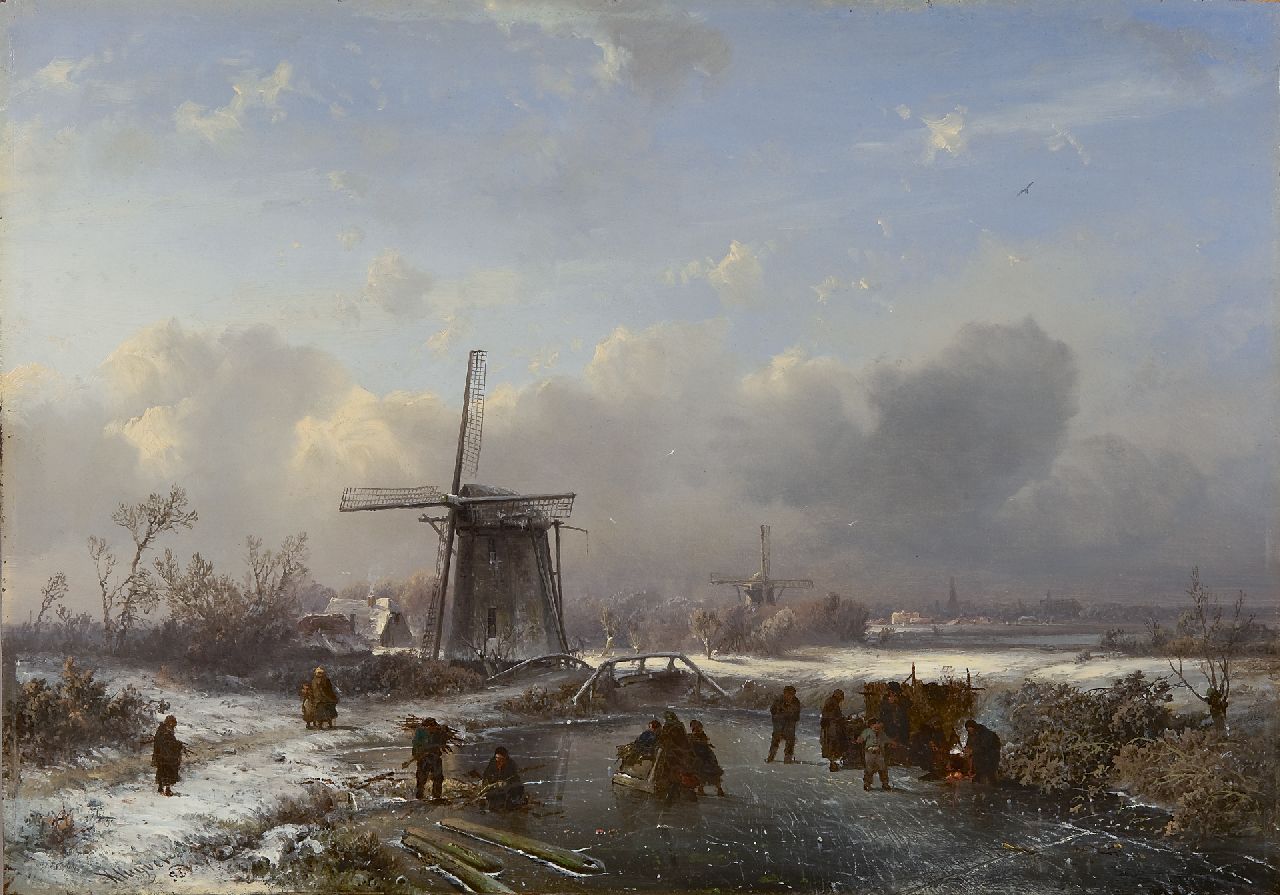 Kluyver P.L.F.  | 'Pieter' Lodewijk Francisco Kluyver, Winterlandschap met schaatsers en koek-en-zopie, olieverf op paneel 32,4 x 46,0 cm, gesigneerd linksonder 'Kluyver' en 'S.L.V. fig.' en te dateren ca. 1850-1855