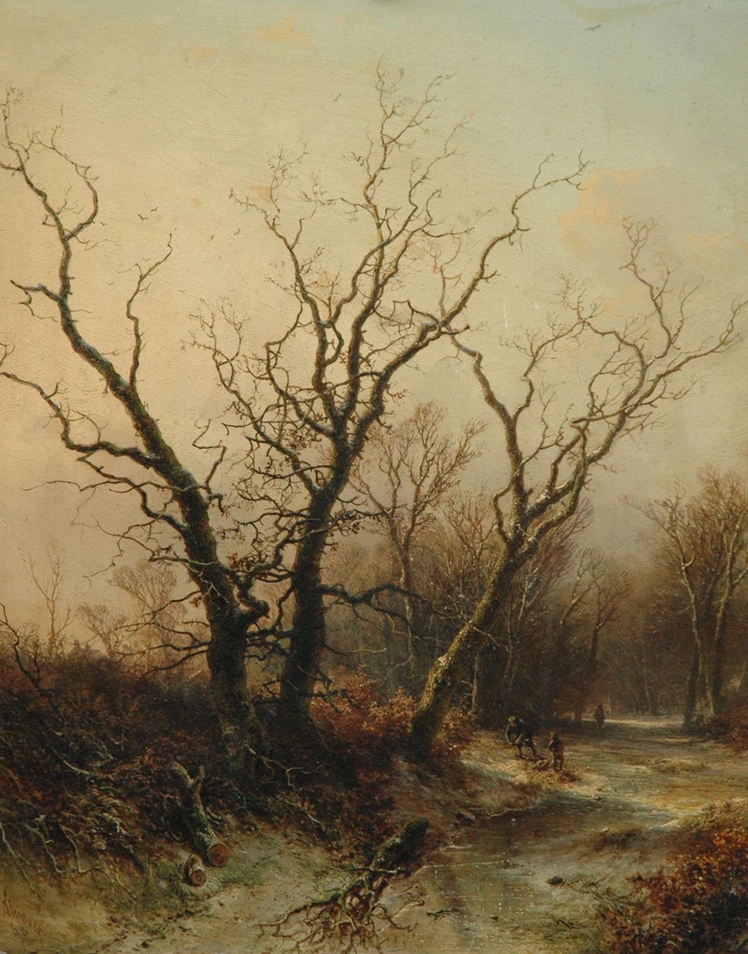 Pieter Kluyver kunstwerk • schilderij • voorheen te koop Winters boslandschap met houtsprokkelaars