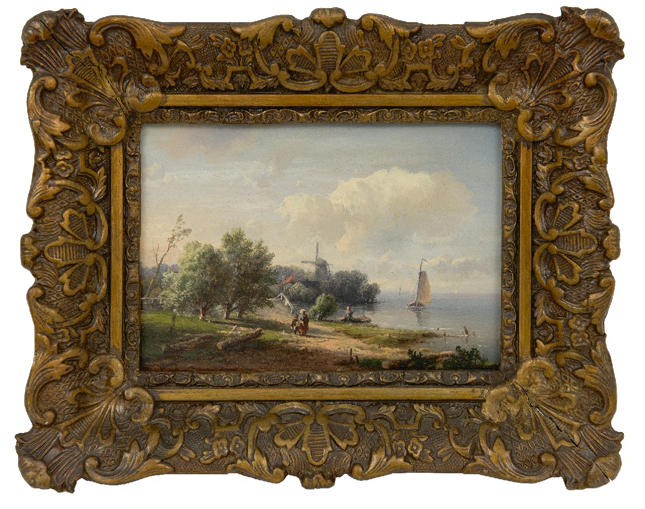 Pieter Kluyver kunstwerk • schilderij • te koop Zomers landschap met figuren en molen langs het water