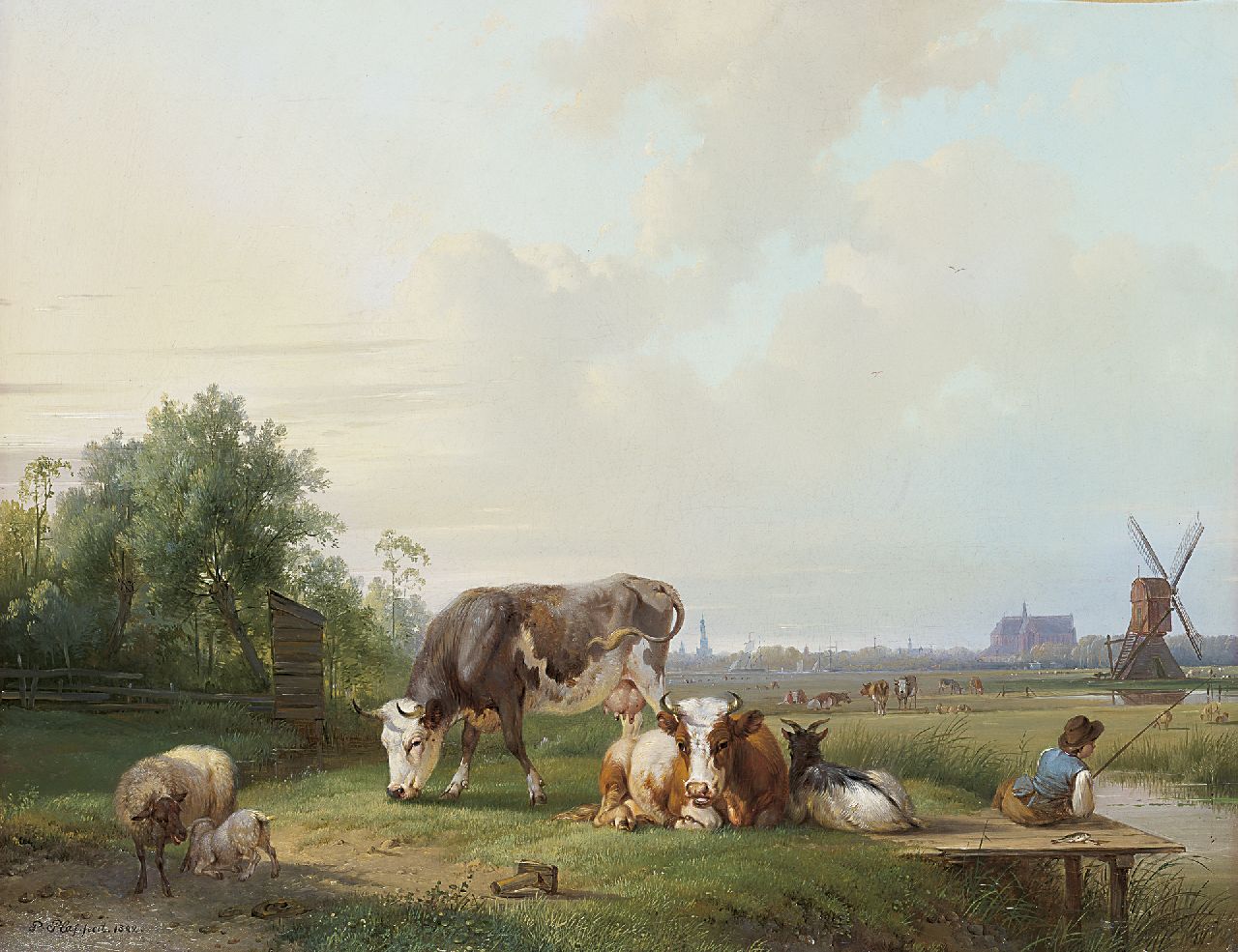 Pieter Plas kunstwerk • schilderij • voorheen te koop Rustend vee en hengelaar in een pastoraal landschap, Alkmaar in het verschiet
