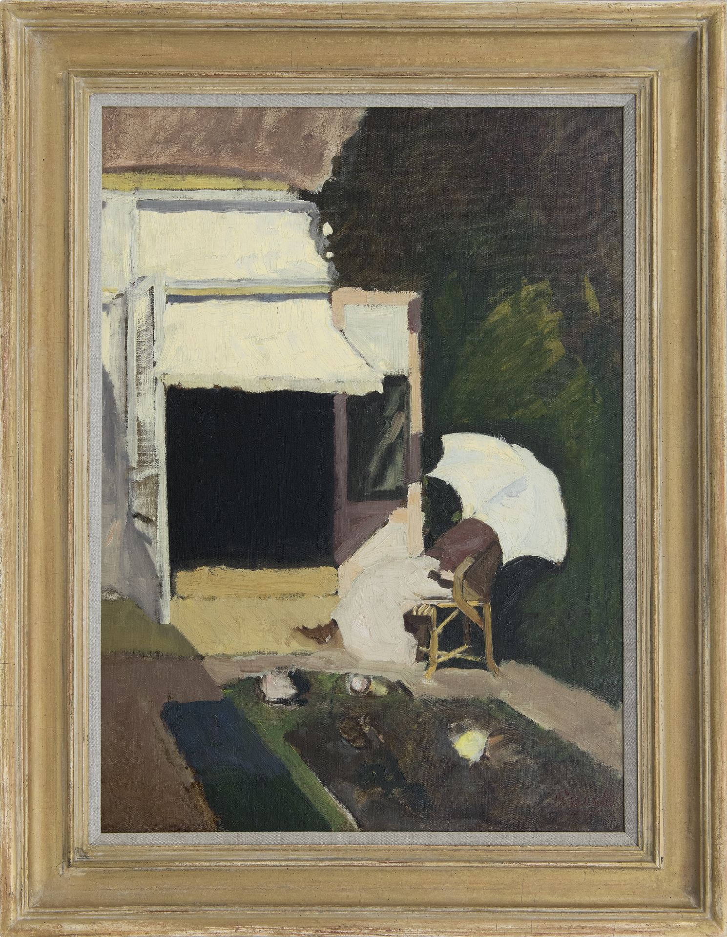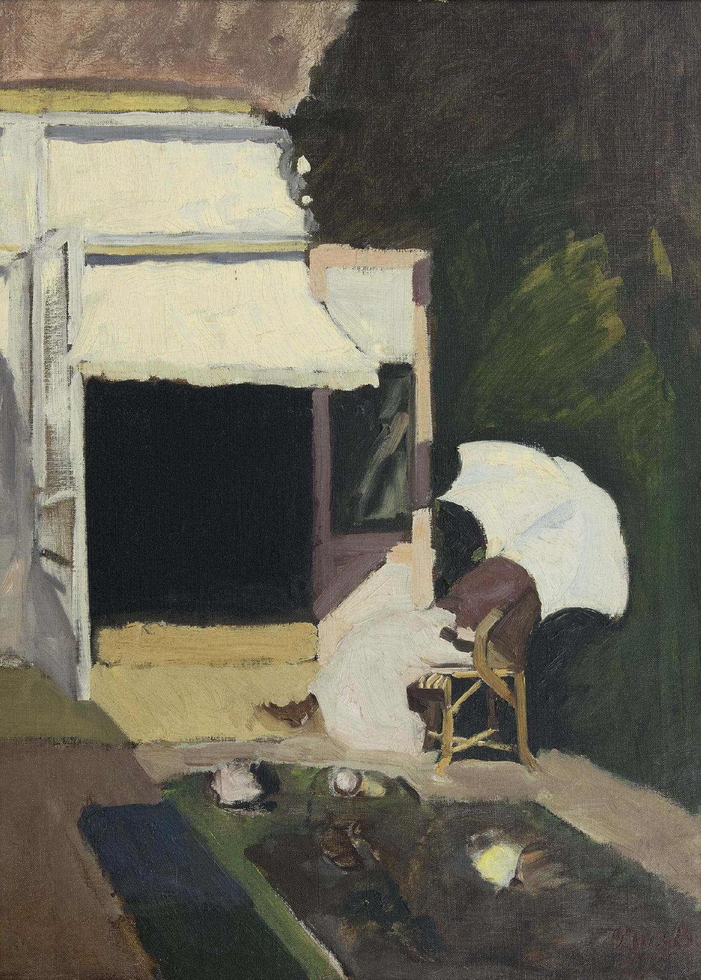 Dit schilderij van een vrouw zittend onder een parasol op het terras was een zeer geliefd onderwerp van de impressionisten. In dit intieme tafereel maakte Van Baarsel gebruik van contrasterende kleuren.
