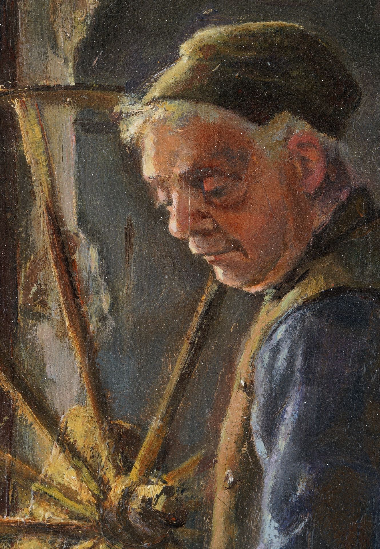 Pieternella Jaarsma kunstwerk • schilderij • te koop Interieur met wol spinnende boer
