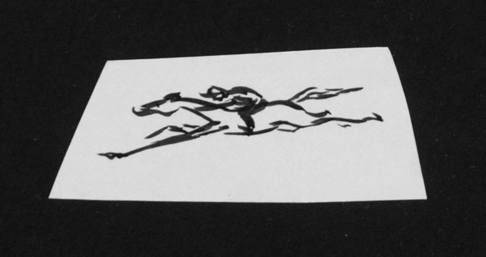Oranje-Nassau (Prinses Beatrix) B.W.A. van | Beatrix Wilhelmina Armgard van Oranje-Nassau (Prinses Beatrix), Rennend paard met jockey, potlood en Oost-Indische inkt op papier 3,0 x 7,1 cm, te dateren augustus 1960