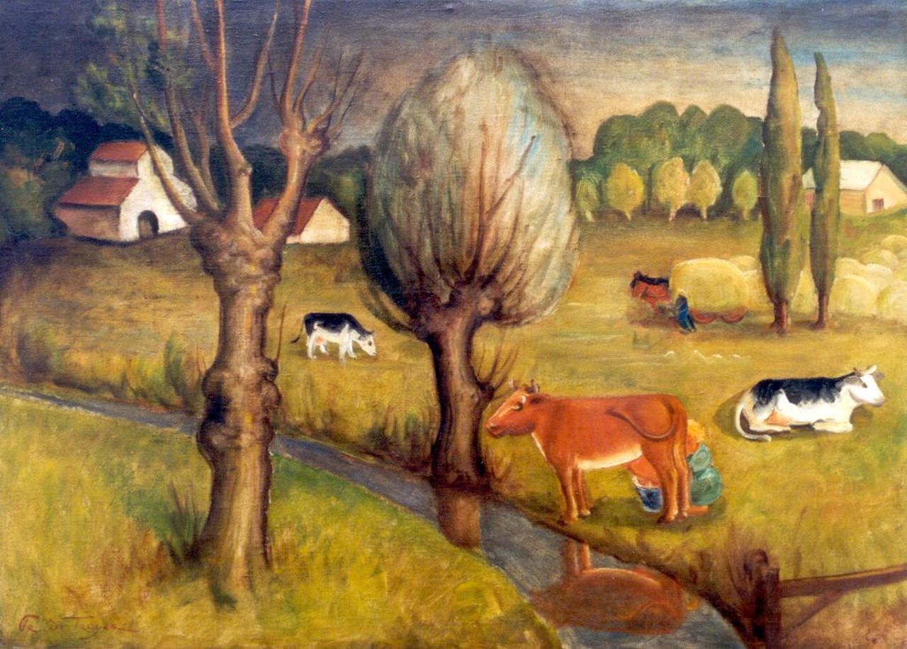 Prosper de Troyer kunstwerk • schilderij • voorheen te koop Landschap met melkende boer en koeien
