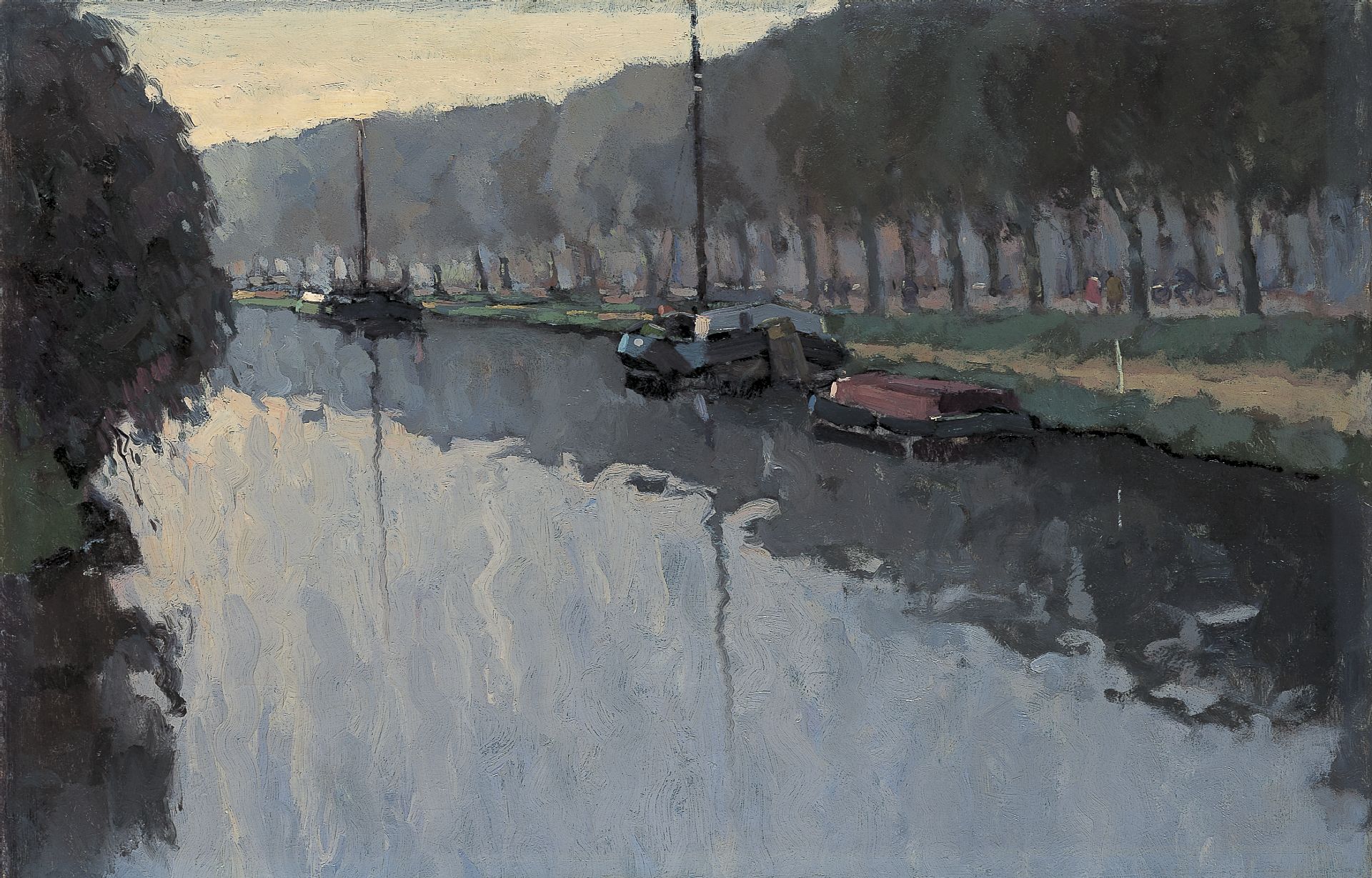 Raoul Hynckes kunstwerk • schilderij • voorheen te koop Afgemeerde schepen aan de Drentse Hoofdvaart