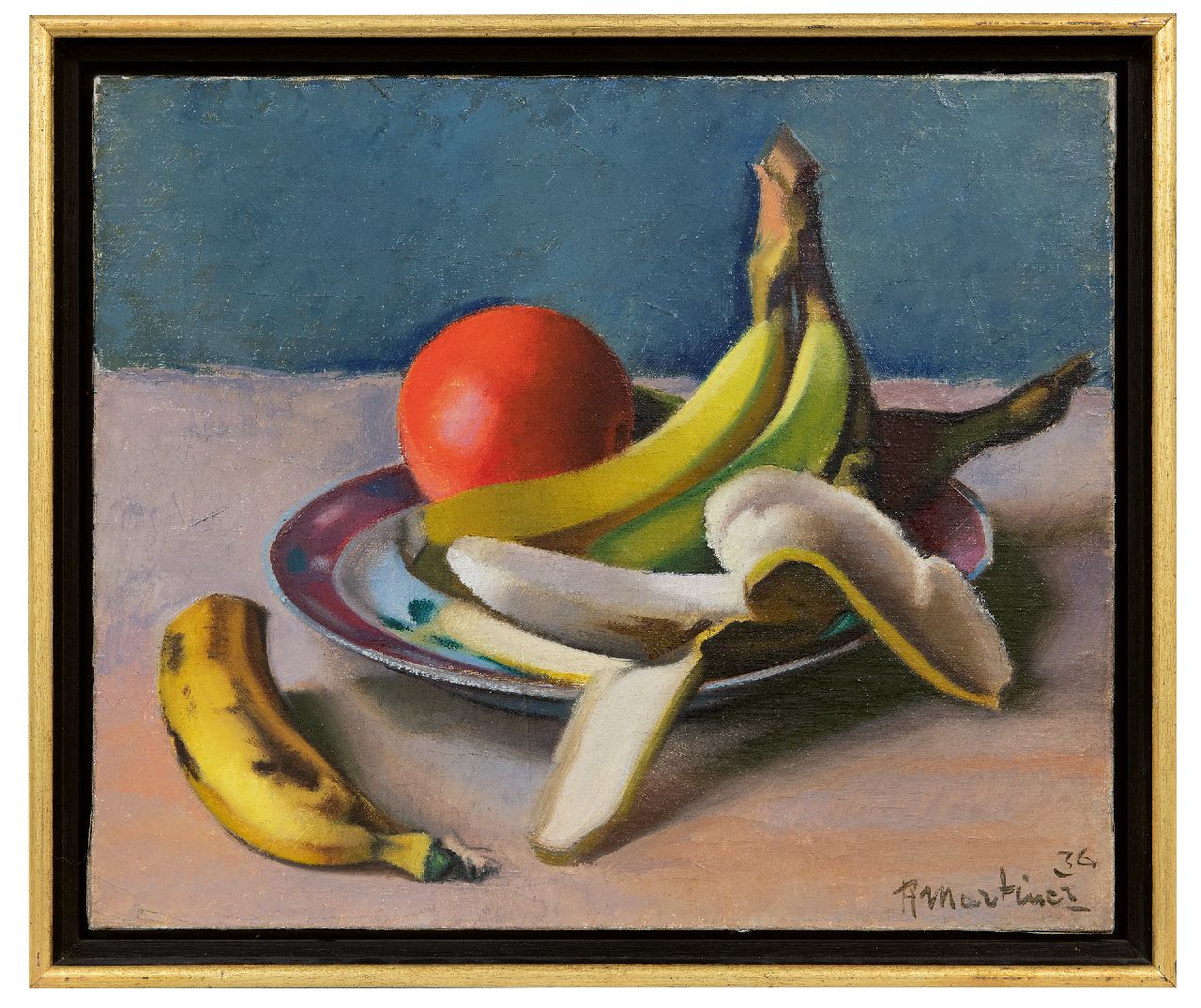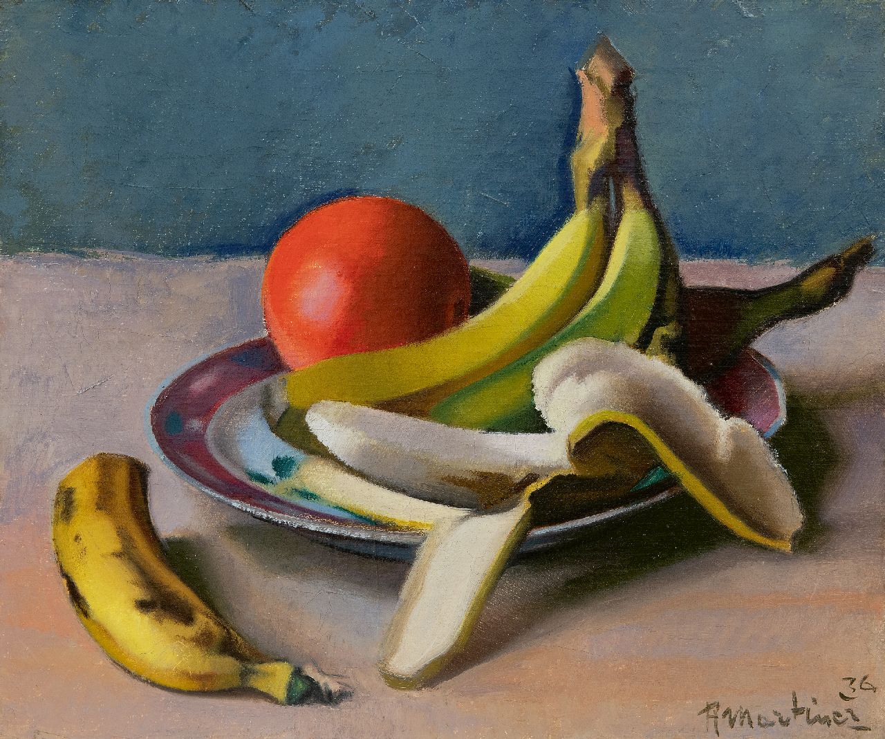 Raoul Martinez kunstwerk • schilderij • te koop Stilleven met bananen en sinaasappel