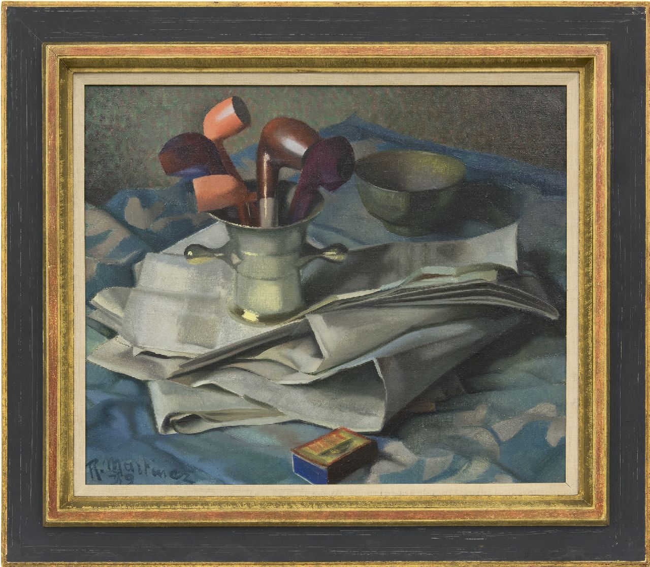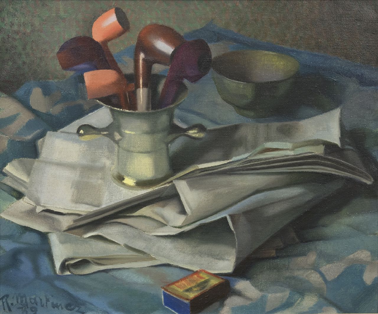 Raoul Martinez kunstwerk • schilderij • te koop Vijzel met pijpen en courant