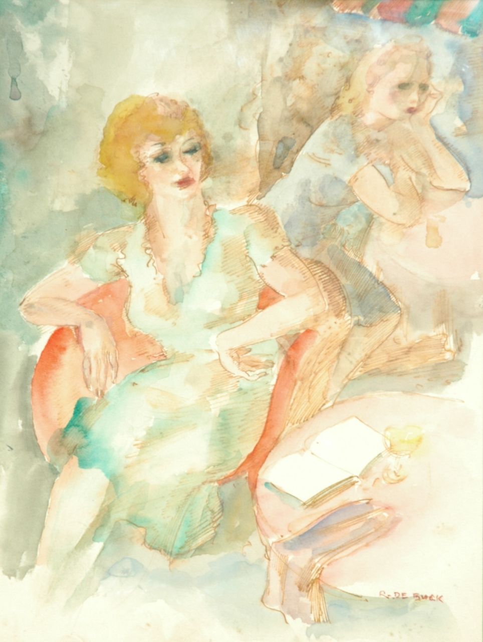 Raphaël de Buck | Twee vrouwen in het café, aquarel op papier, 69,0 x 53,0 cm, gesigneerd r.o.