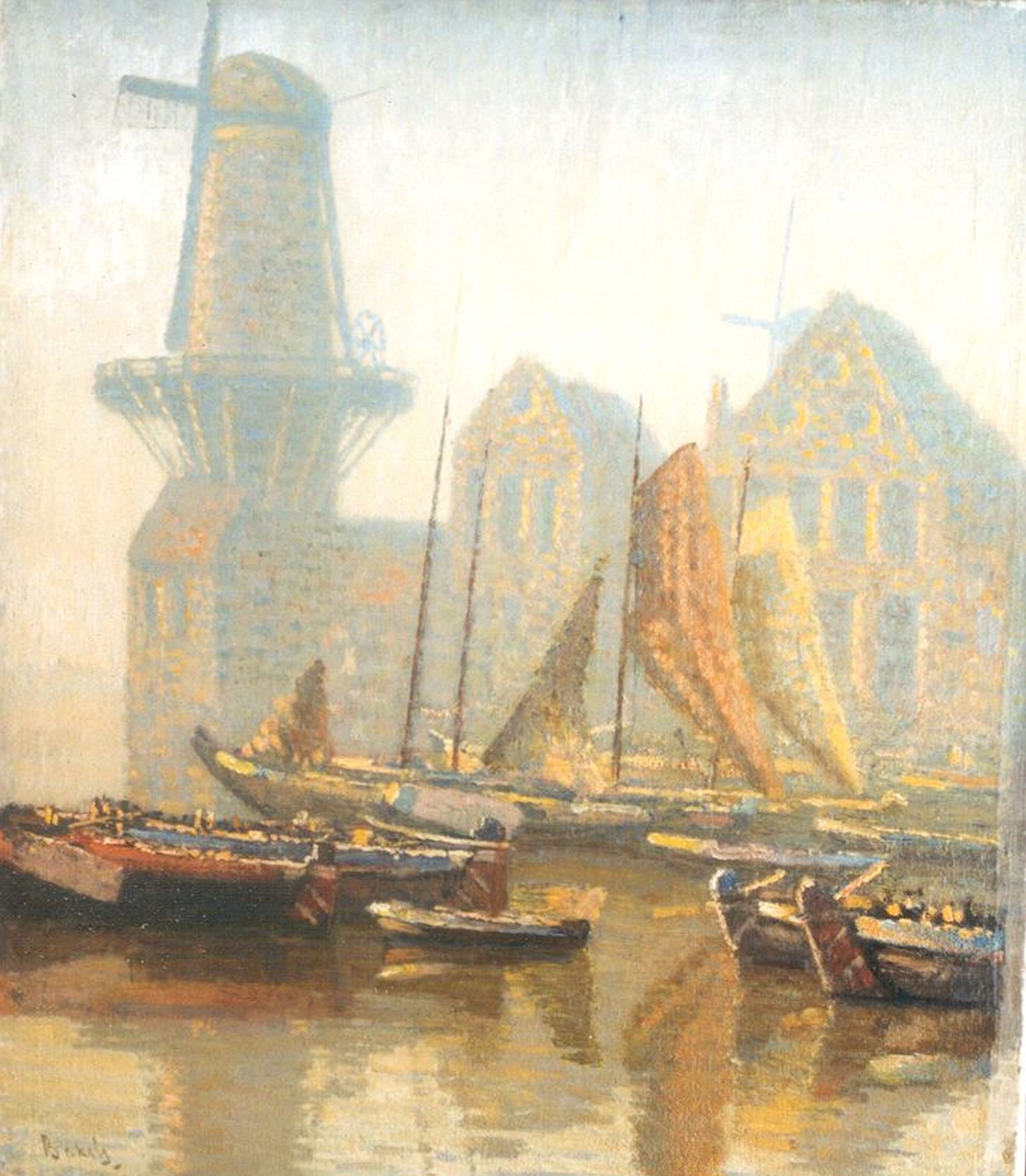 Reinier Sybrand Bakels kunstwerk • schilderij • voorheen te koop Vissersschepen met molen, Delfshaven
