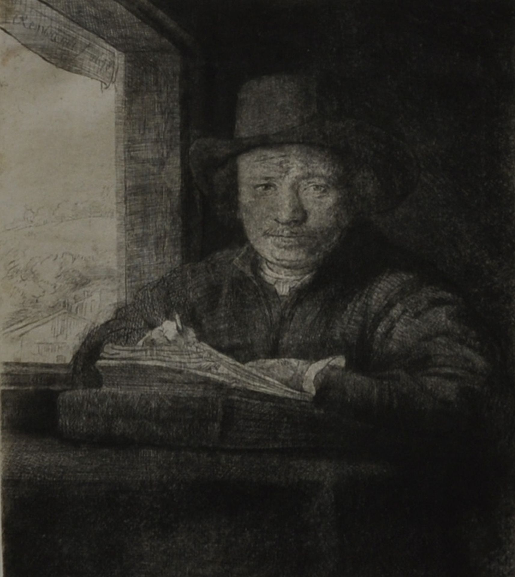 Rembrandt kunstwerk • grafiek • voorheen te koop Zelfportret, etsend bij een raam