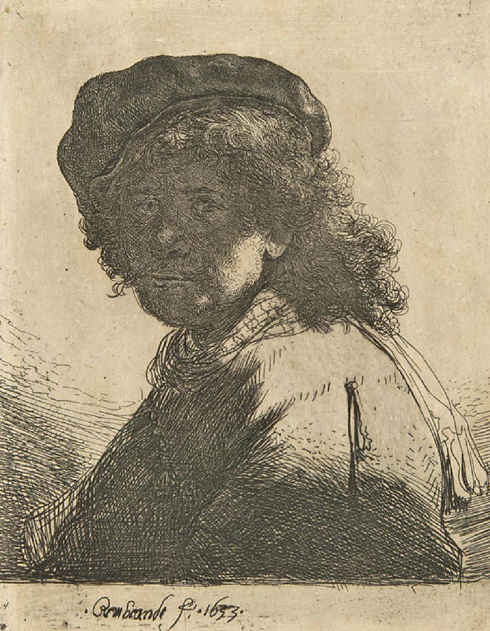 Rembrandt (Rembrandt Harmensz. van Rijn)   | Rembrandt (Rembrandt Harmensz. van Rijn), Zelfportret met baret en halsdoek, ets op papier 13,2 x 10,3 cm, gesigneerd middenonder in de plaat en gedateerd 1633 in de plaat