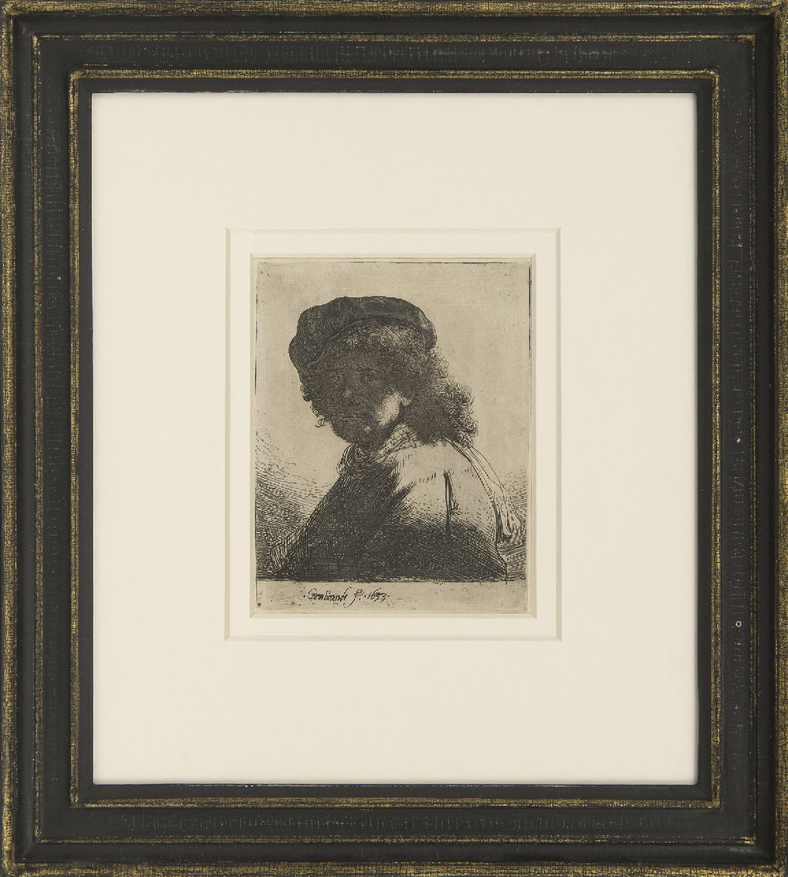 Rembrandt kunstwerk • grafiek • voorheen te koop Zelfportret met baret en halsdoek
