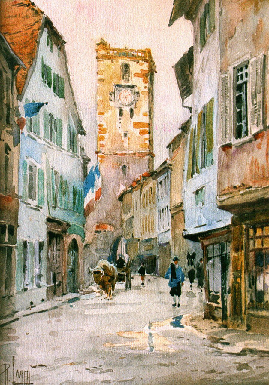 René Leverd kunstwerk • aquarel • tekening • voorheen te koop Straatscene met kerktoren in Ribeauville