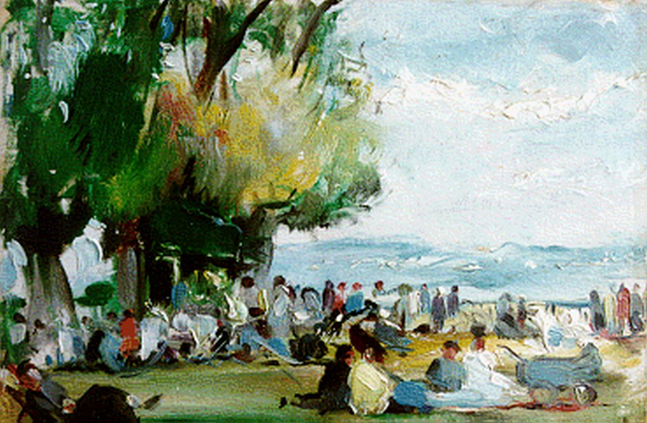 René Pierre Margoteau kunstwerk • schilderij • voorheen te koop Mensen in het park bij een meer