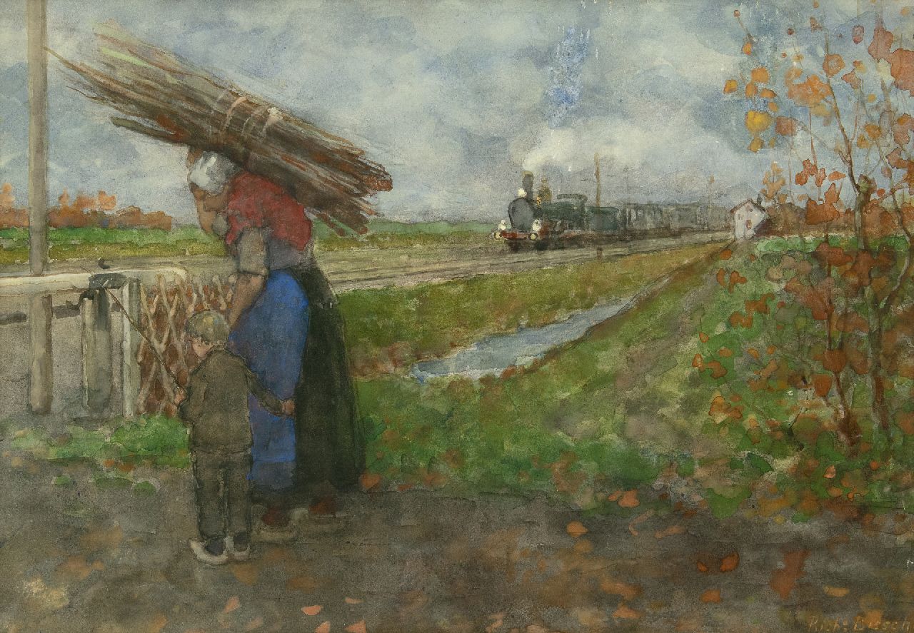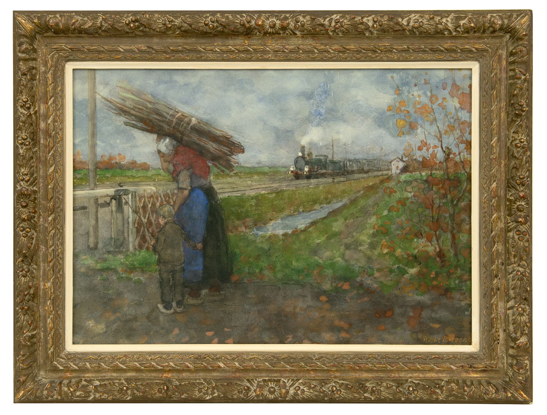 Richard Bisschop kunstwerk • aquarel • tekening • voorheen te koop Wachten voor de trein