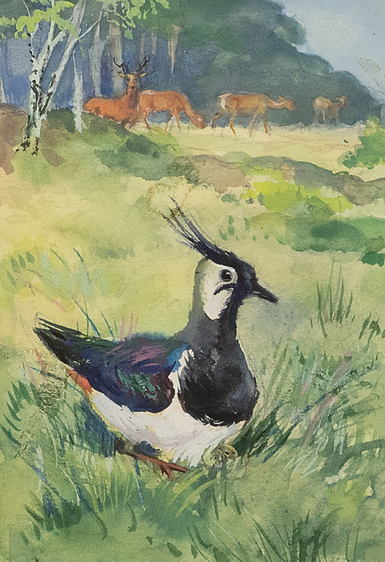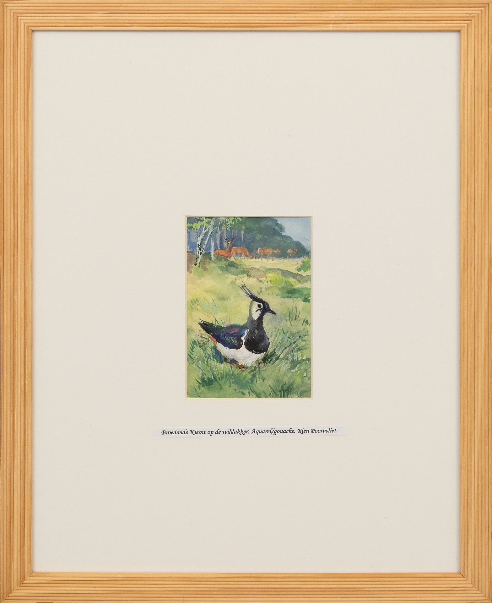 Rien Poortvliet kunstwerk • aquarel • tekening • te koop Broedende Kievit op de wildakker, met reeën Hoge Veluwe