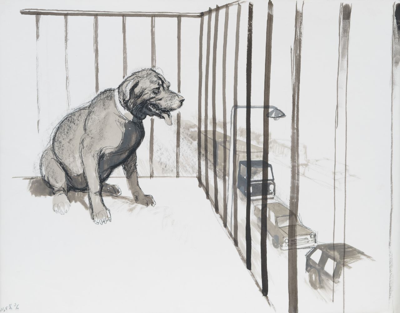Rien Poortvliet kunstwerk • aquarel • tekening • voorheen te koop Het verkeer in de gaten houden