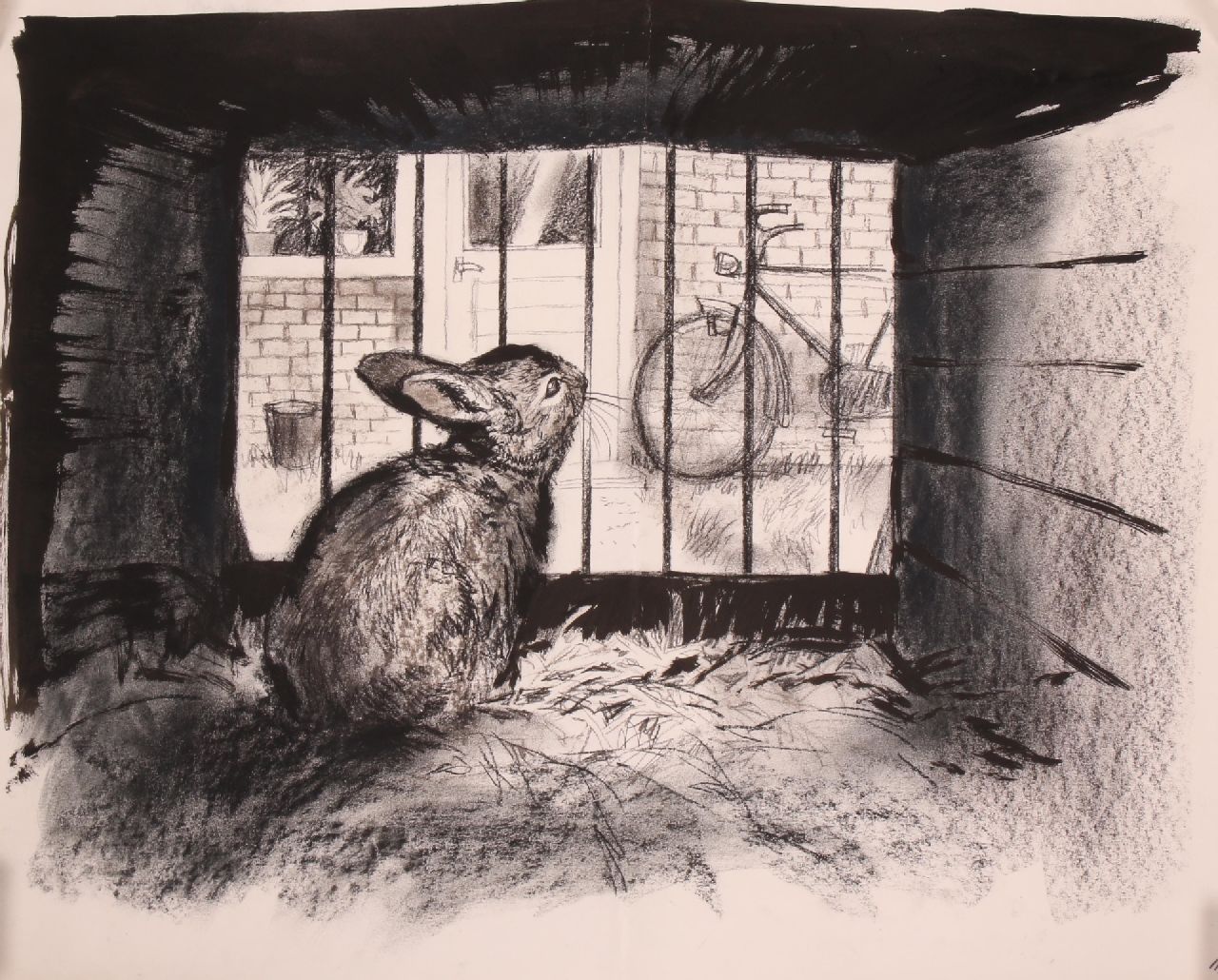 Rien Poortvliet kunstwerk • aquarel • tekening • voorheen te koop Konijntje in hok