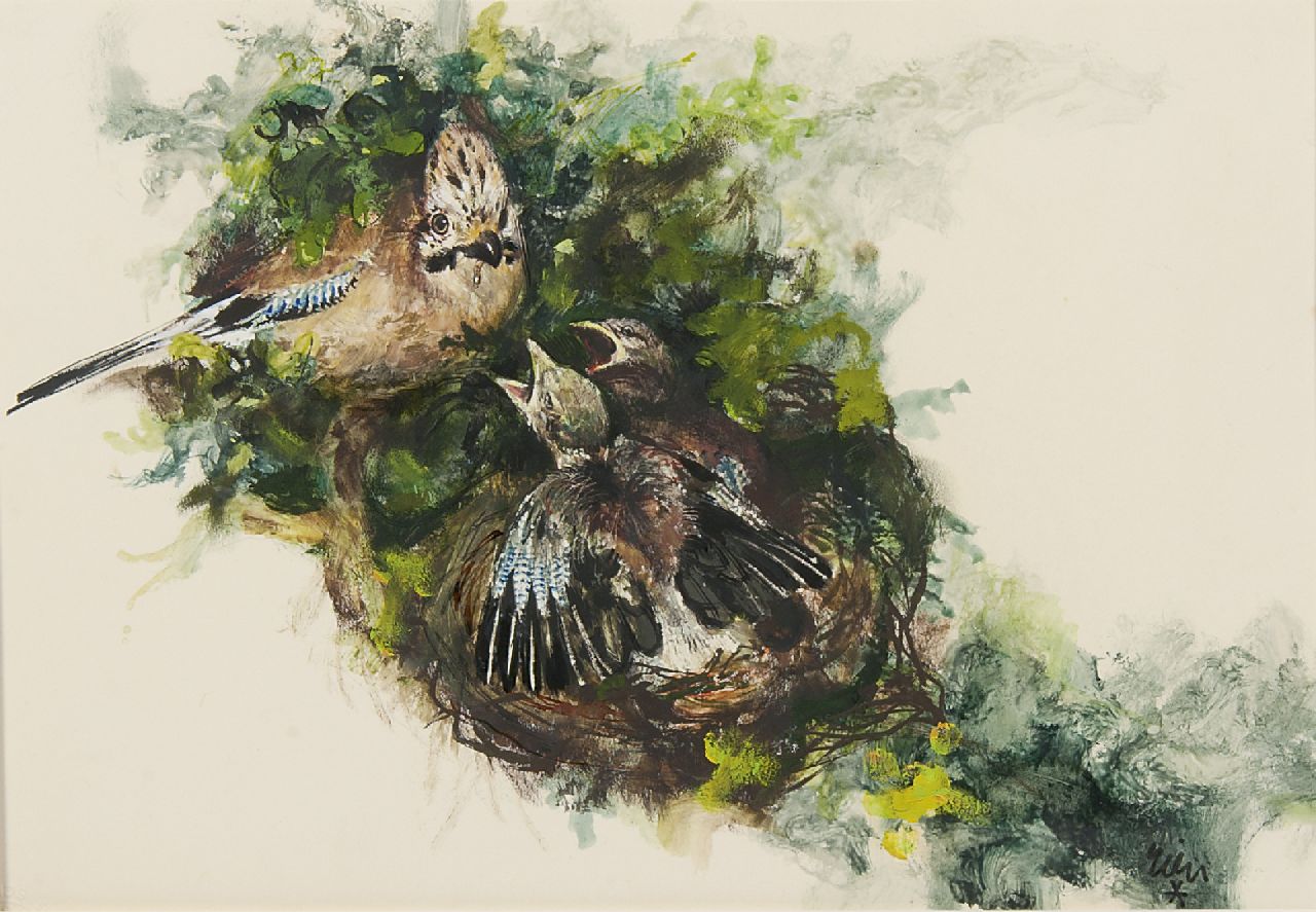 Rien Poortvliet kunstwerk • aquarel • tekening • voorheen te koop Vlaamse gaai haar jongen voedend