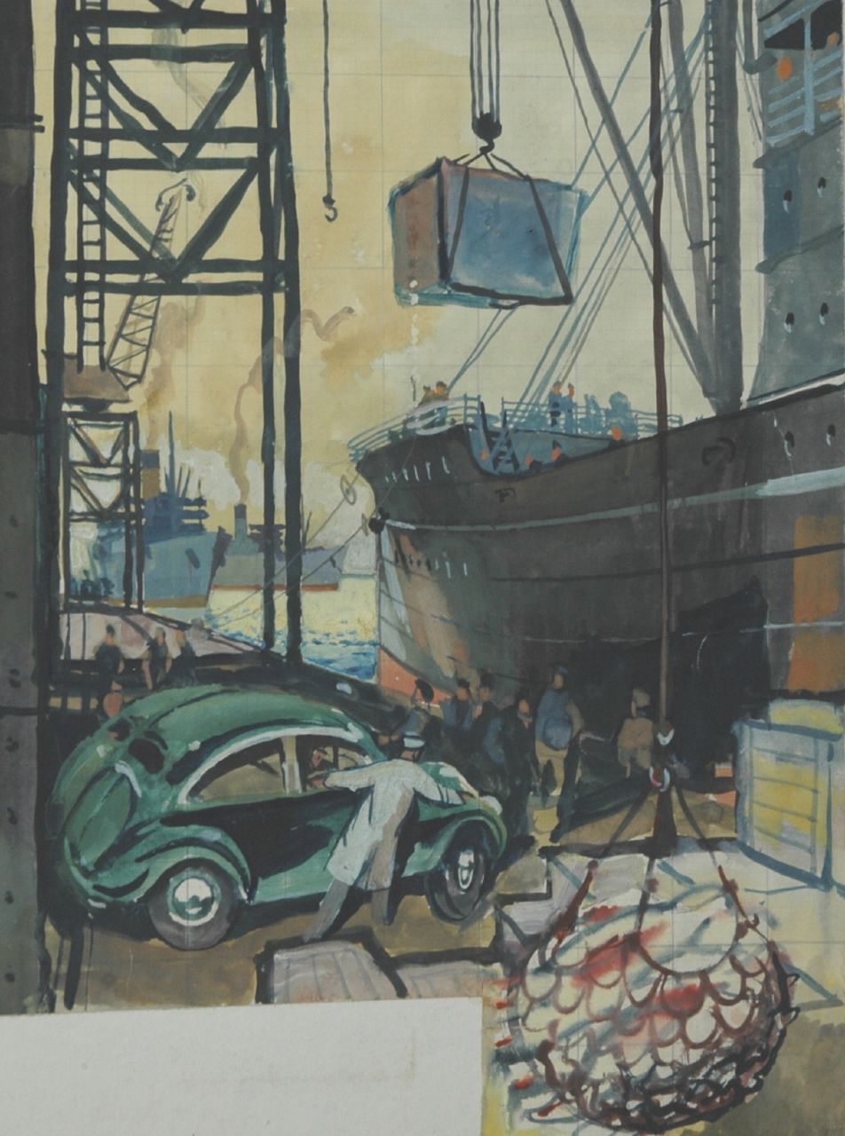Robert Trenaman Back kunstwerk • aquarel • tekening • voorheen te koop Het aan boord hijsen van twee Volkswagens 'Kever'