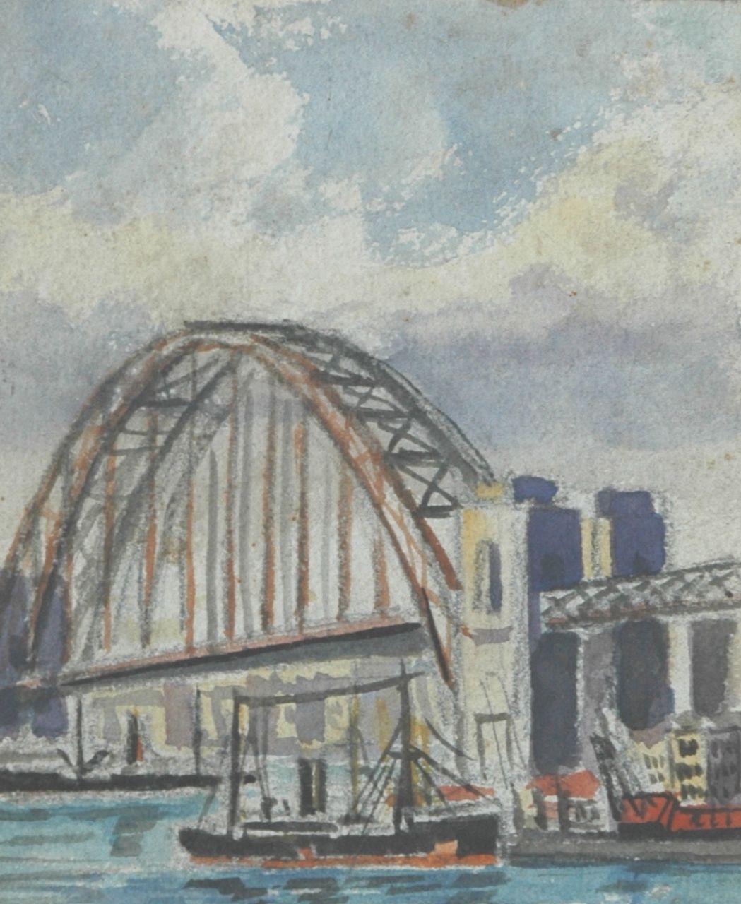 Robert Trenaman Back kunstwerk • aquarel • tekening • voorheen te koop Scheepsverkeer bij de Sydney Harbour Bridge, Sydney, Australië
