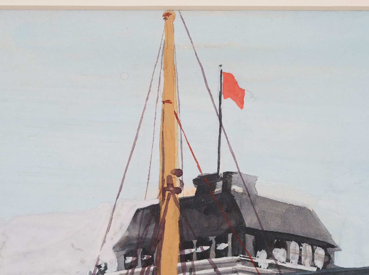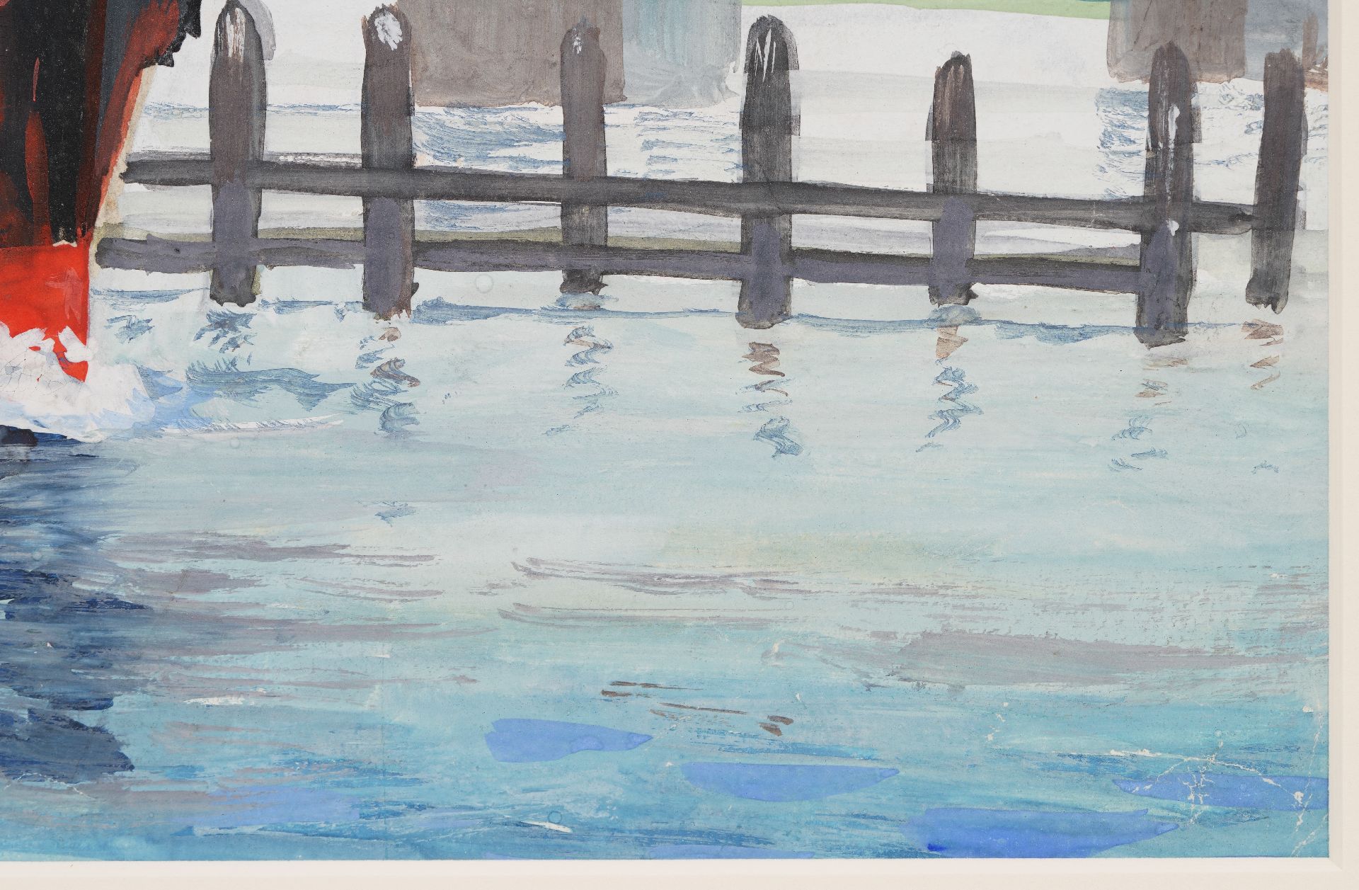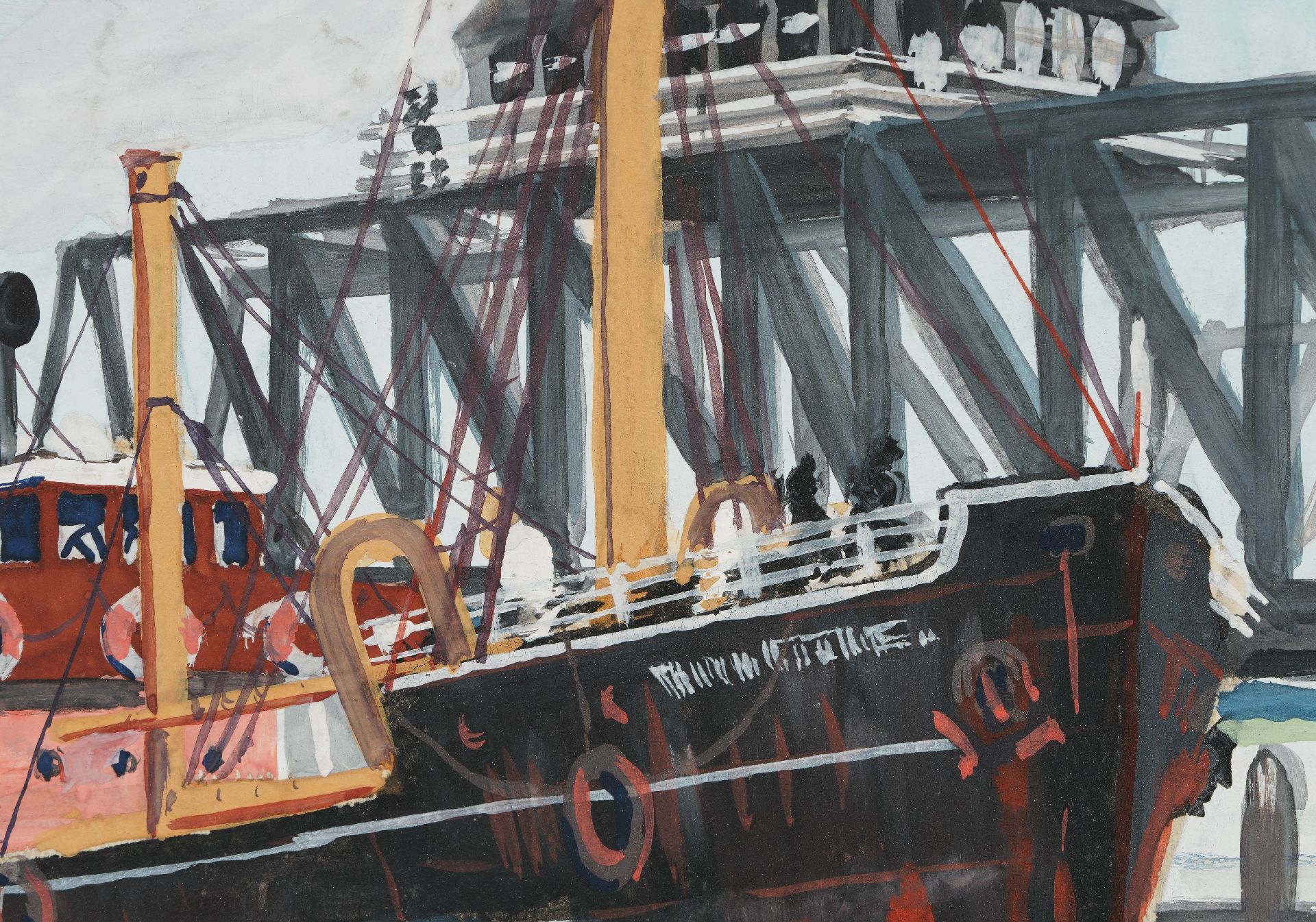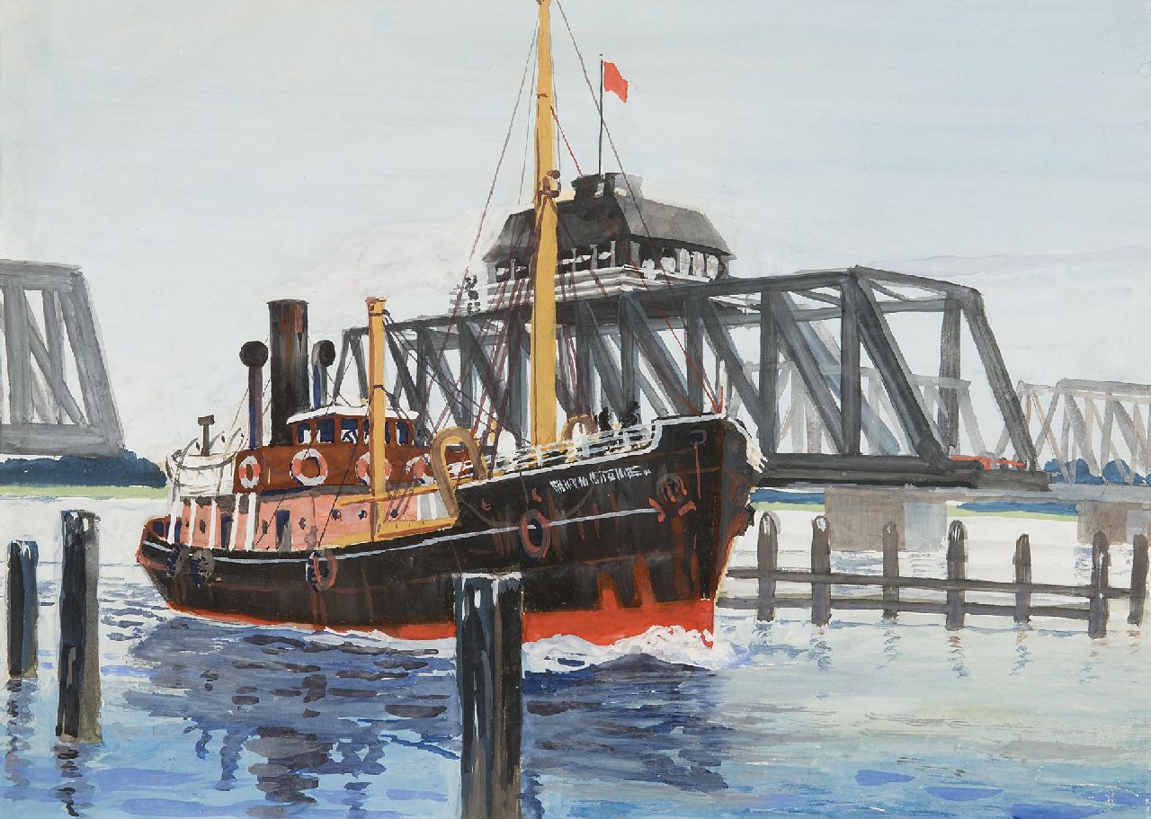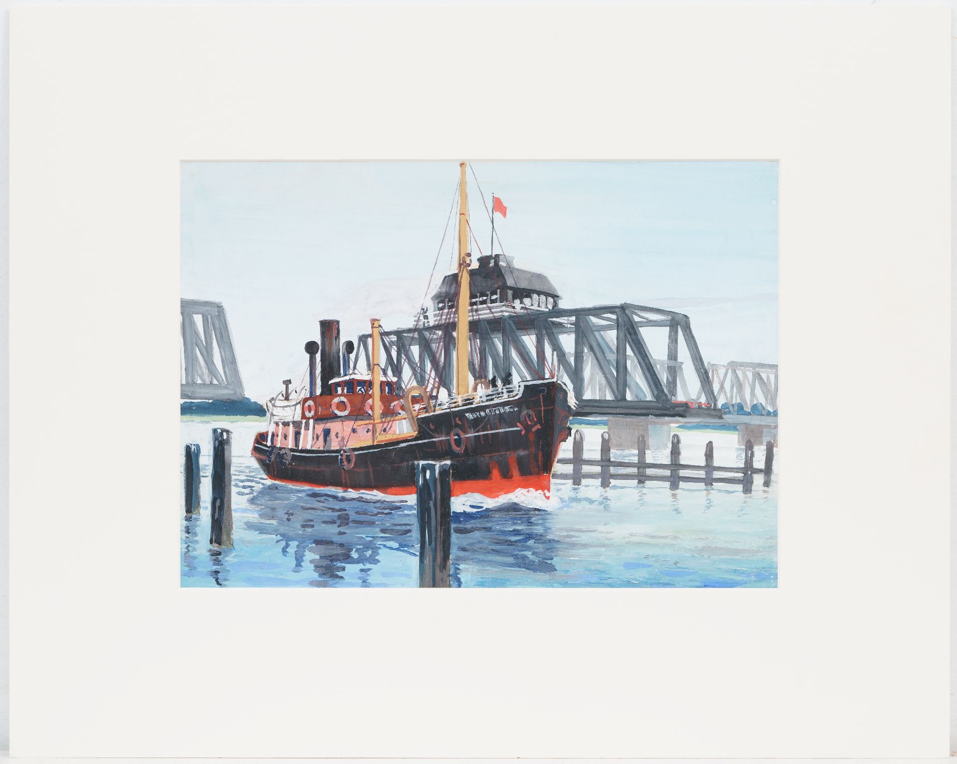 Robert Trenaman Back kunstwerk • aquarel • tekening • voorheen te koop Trawler, varend bij een draaibrug
